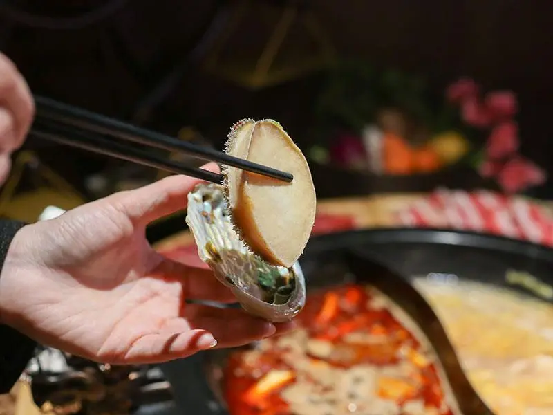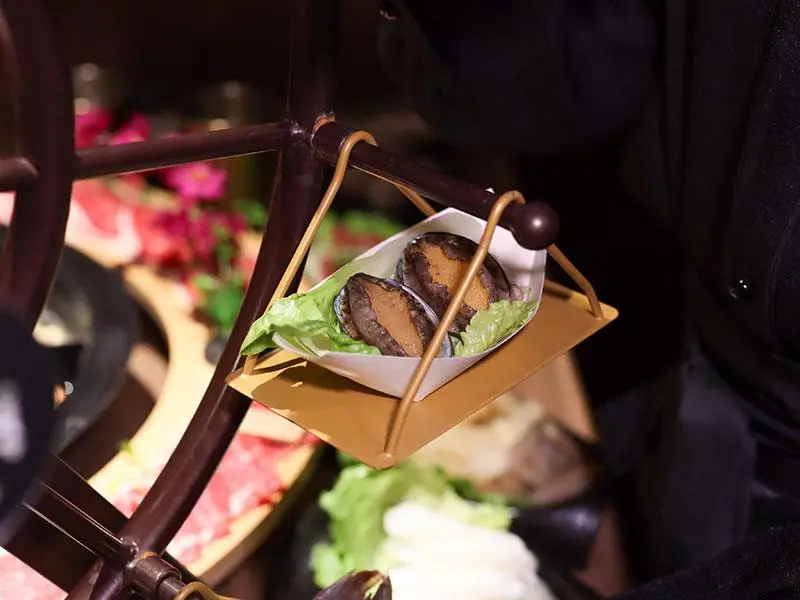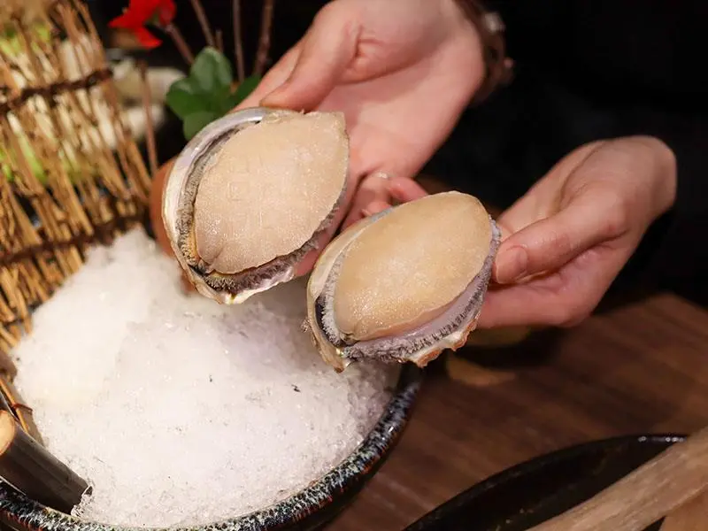 售價 888 元的海鮮八品以摩天輪造型浮誇上桌。集結阿根廷天使蝦、大草蝦、海白蝦、小章魚、船凍小卷、蛤蜊、珍珠鮑與鯛魚片。天使紅蝦軟綿吸汁,蛤蜊水嫩鮮甜,小章魚帶有迷人脆感。喜愛頂級海味必點半份 358 元的活體南非鮑魚,尺寸碩大且咬感厚實帶彈,完美呈現極致鮮度。