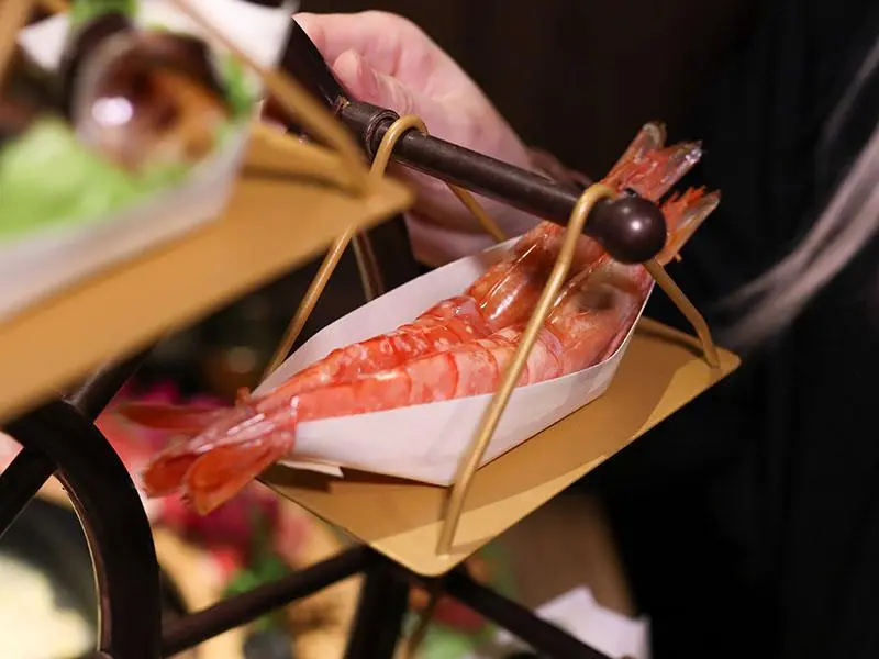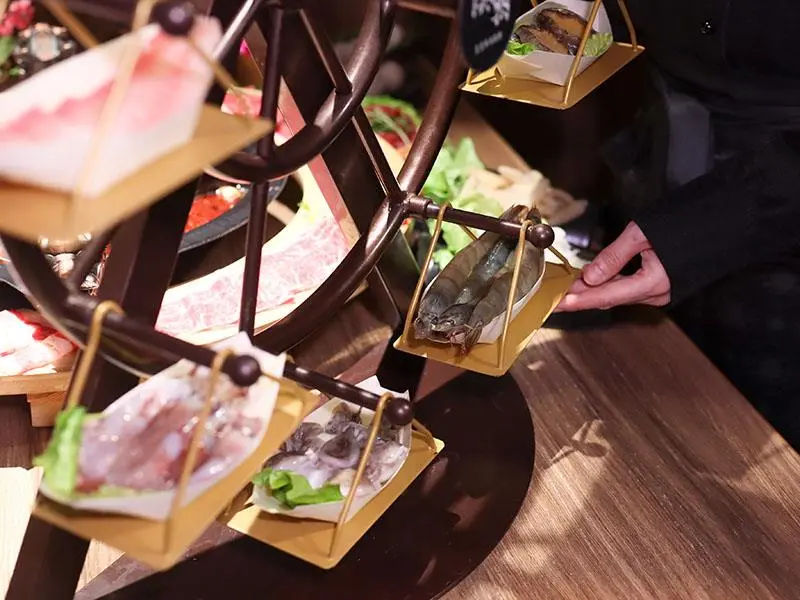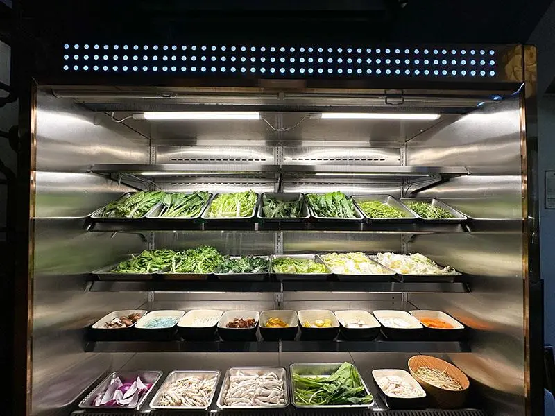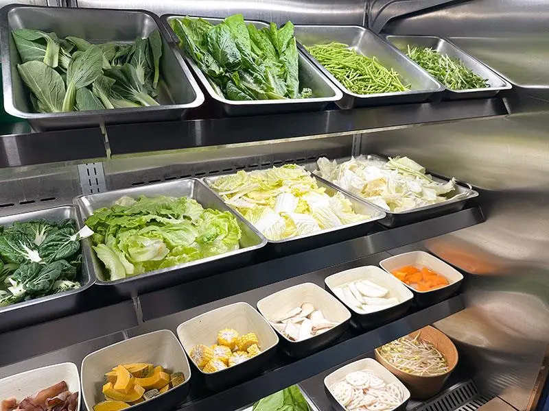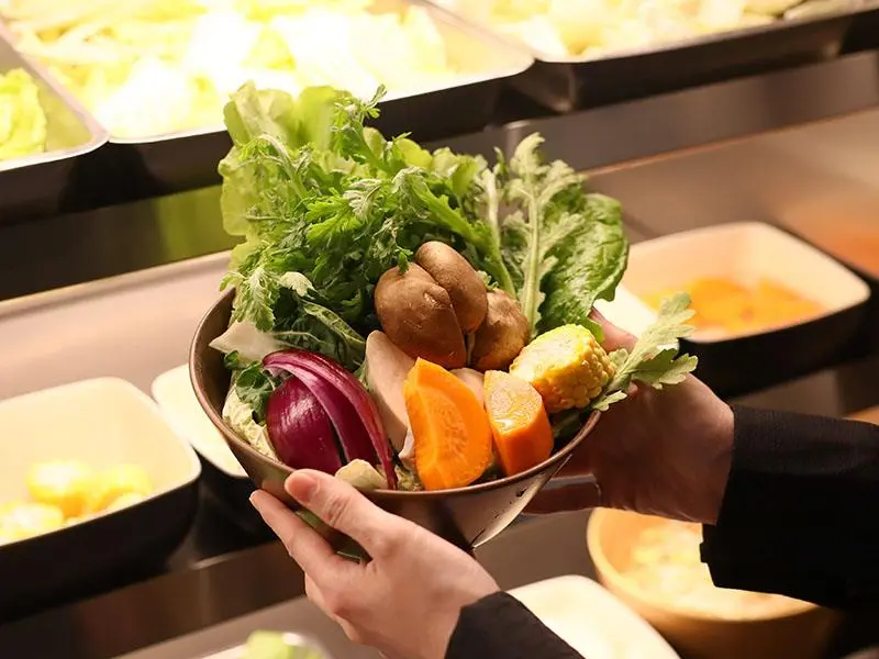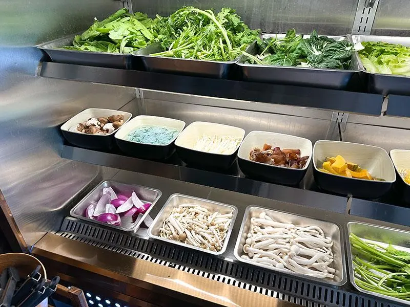 品嚐大魚大肉之餘,自助吧台的蔬食區同樣充滿誠意。備有茼蒿、奶油白菜與娃娃菜等多樣新鮮蔬菜,供食客無限取用,完美平衡重口味的火鍋湯底。主食部分則提供白飯,食客可發揮創意自製誘人的牛丼飯,搭配麻辣湯頭極度豐盛,帶來極大的飽足感。