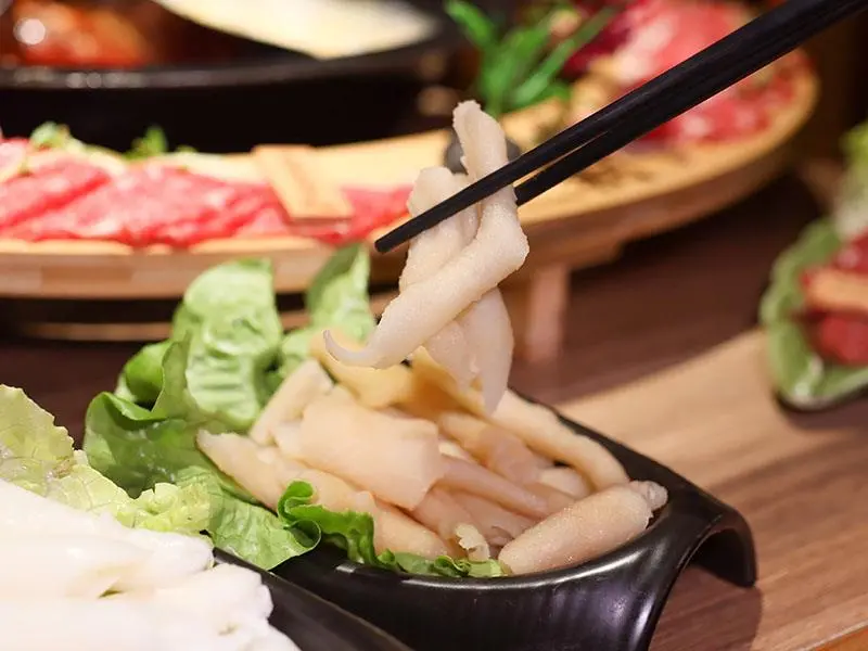 若喜愛豐沛油脂,強烈推薦加點半份 330 元的無骨牛小排,入鍋涮熟後散發極致迷人的濃郁肉香。品嚐麻辣鍋絕對不能錯過經典內臟,半份 150 元的黃喉與 158 元的鴨腸皆走爽脆路線。內臟類食材只需在滾湯中輕涮數秒即可撈起,展現極佳嚼勁,切記避免久煮以免縮水影響口感。