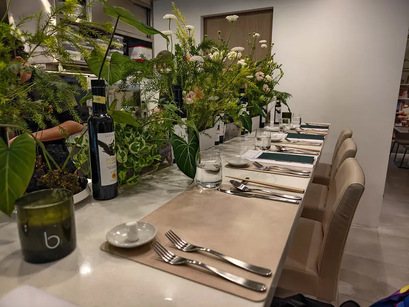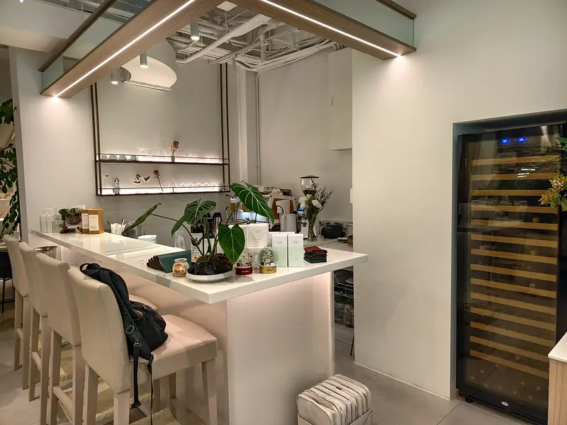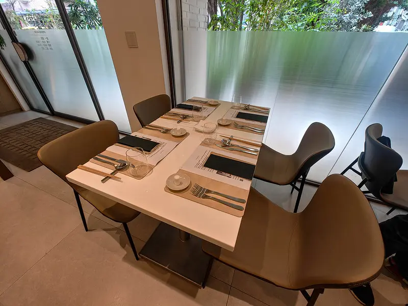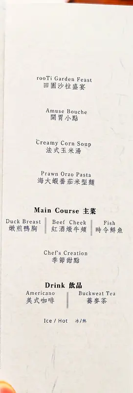 轉進永康街 31 巷,避開了主幹道的人潮, rooTi 宛如一處隱密綠洲座落於永康公園旁。門前鋪設著仿歐式石板路,伴隨高及人腰的綠色植栽,散發出獨特的異國風情。室內空間以米白與木質色調交錯,中央設置了一座大型中島吧台,空氣中隱約飄散著淡淡香氛與烤蔬果的迷人氣息。這裡打破了傳統高級餐廳令人喘不過氣的拘謹,營造出宛如前往歐洲友人宅邸作客般的自在感。餐點採預約制的無菜單套餐形式,菜色會依照季節時令進行調整,並需另加 10% 服務費。