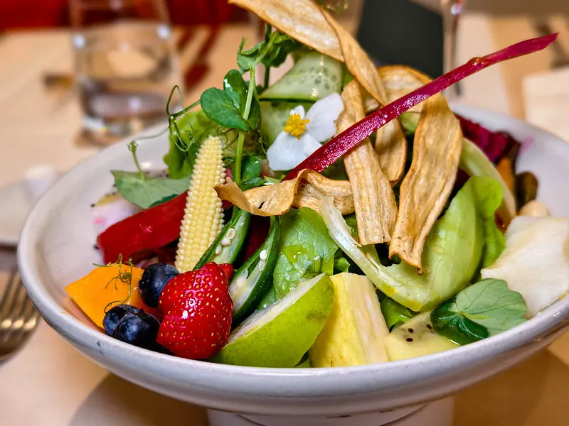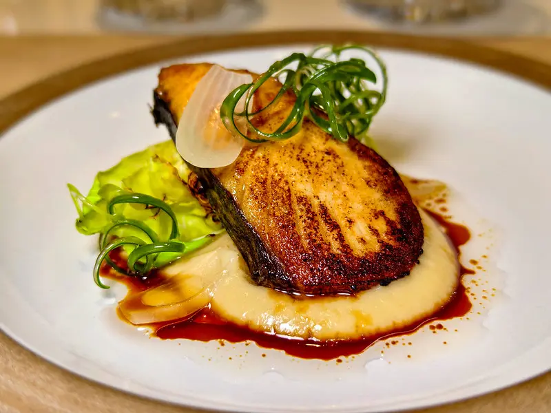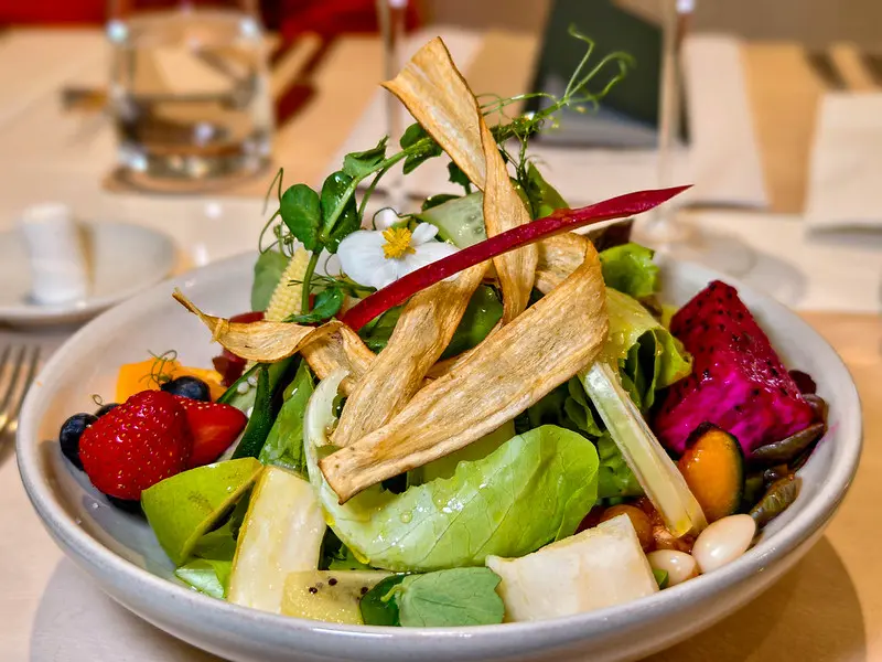 遵循地中海飲食的健康邏輯,首道端上的田園沙拉盛宴展現了極致的誠意。匯集大量當季生菜與新鮮水果,純粹運用頂級初榨橄欖油與些許油醋帶出自然甜味。前菜煎鮮土魠魚搭老虎奶將魚肉表面微煎至金黃酥脆的恰恰狀態,切開後內裡依然粉嫩且飽含汁水,搭配微酸醬汁完美襯托出魚肉的鮮甜。