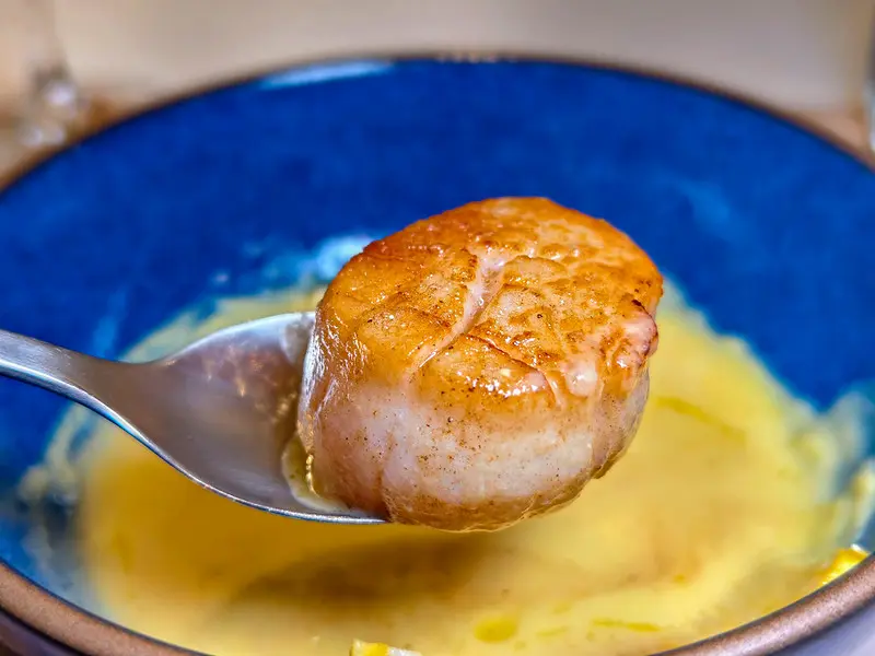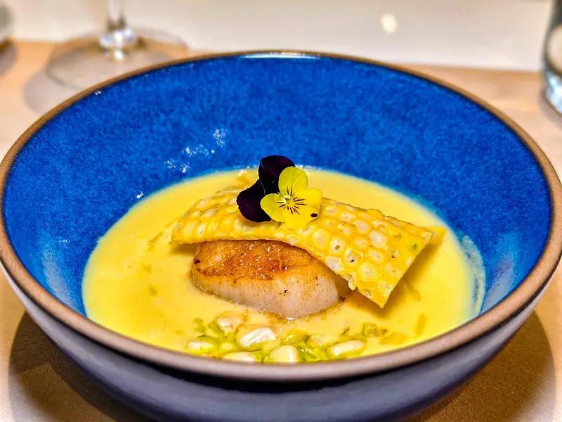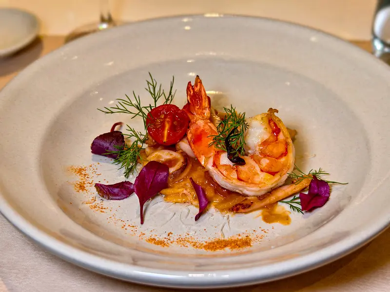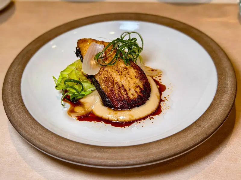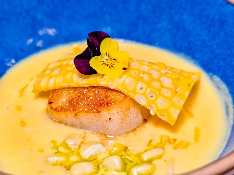 法式玉米湯採用全食概念,將水果玉米手工刨下研磨成泥,不刻意勾芡,喝得出慢火煨煮的溫潤自然甜味,搭配煎至金黃的新鮮干貝更是絕配。承接主菜前的海大蝦番茄米型麵同樣不馬虎,米麵完美吸附了番茄與海鮮高湯,口感彈牙滑溜。上方的海大蝦肉質緊實,番茄酸香與蝦肉鮮甜取得了極佳平衡。