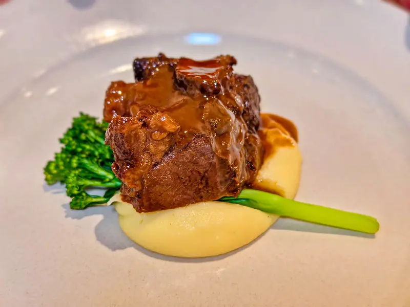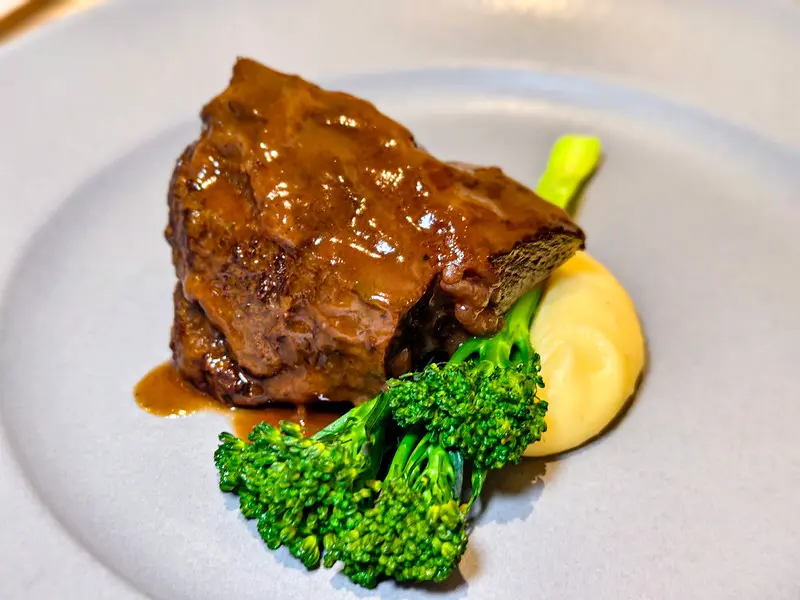 緊接著登場的嫩煎鴨胸是全場最大驚喜。表皮煎得極為酥脆並成功逼出皮下油脂香氣,切面的肉質卻保持著均勻粉嫩,多汁且富含彈性,絲毫沒有乾柴之感。另一道主菜紅酒燉牛頰經過長時間慢火伺候,醬汁收得濃郁甘醇。只需用刀叉輕輕一撥便能將肉塊分離,入口瞬間化為滿滿膠質感,將慢食精華完美呈現。