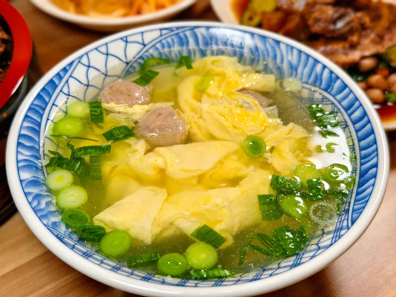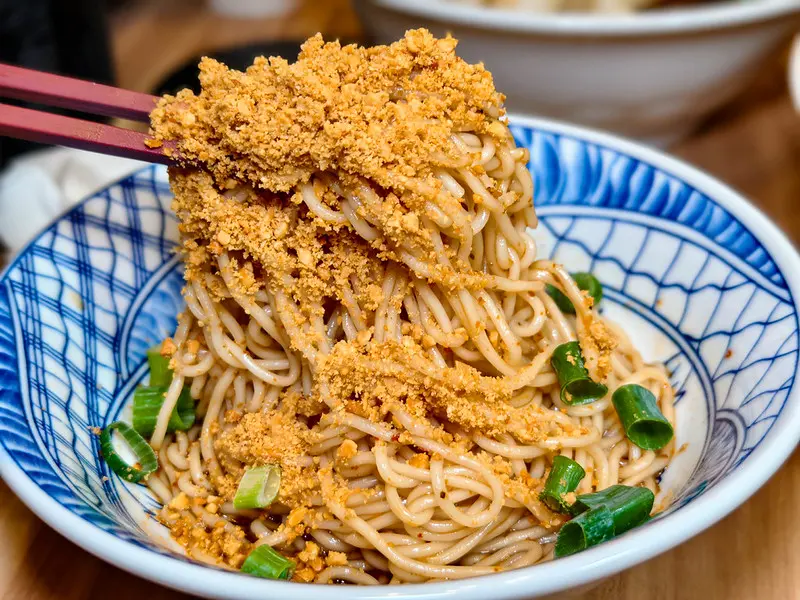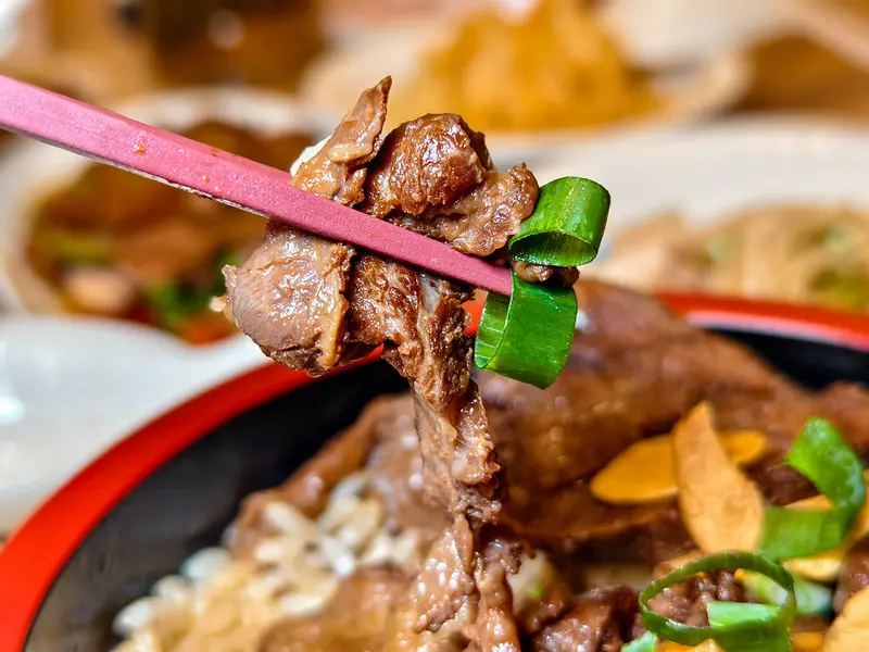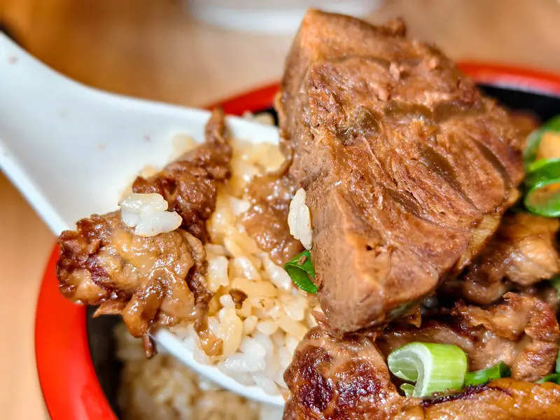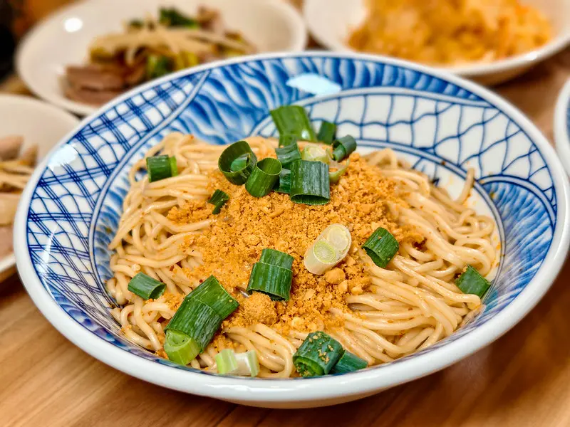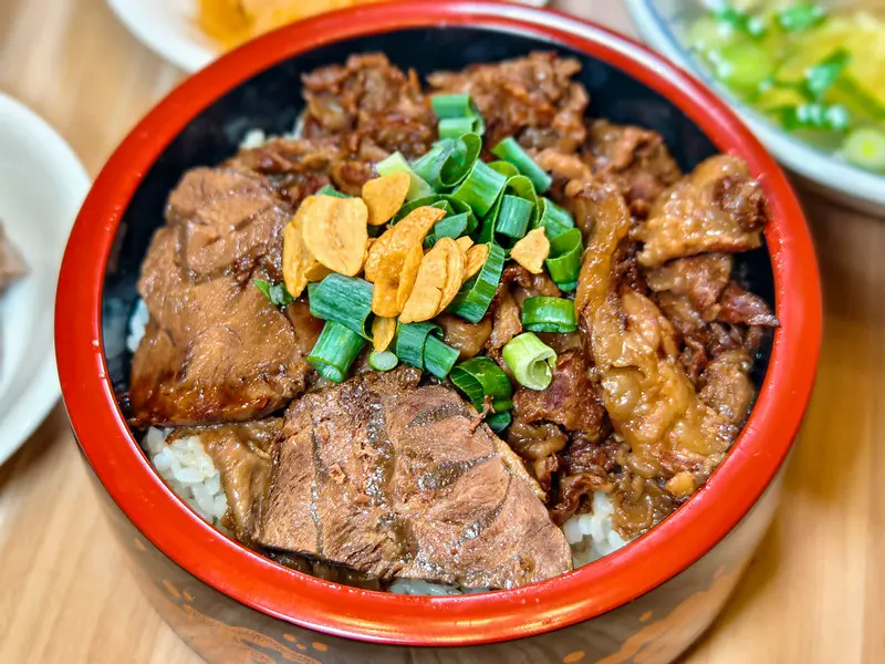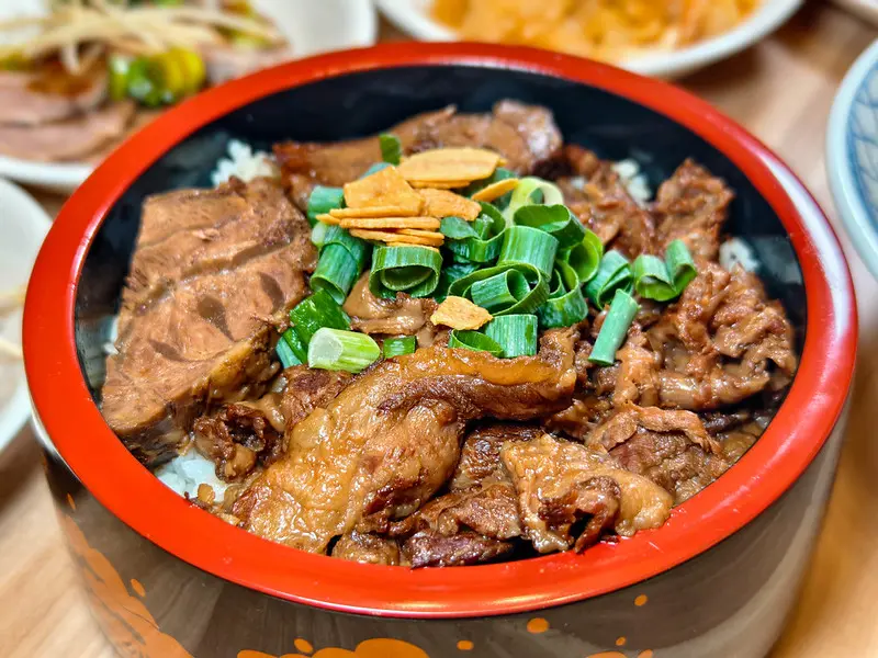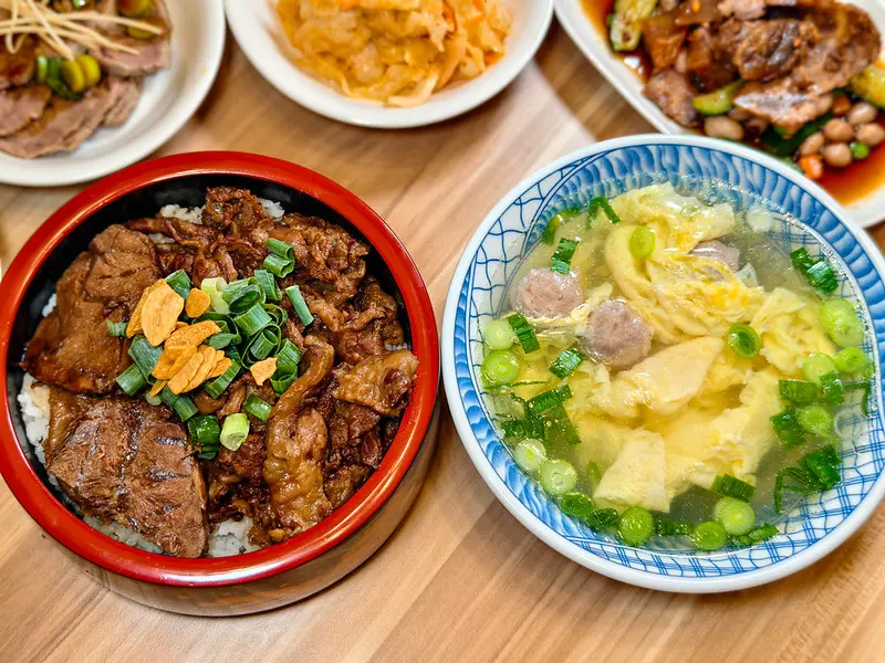定價 250 元的日式滷牛肉丼飯,在米飯上鋪滿滷透的牛腱與鮮活牛肉片。兩種部位與料理手法交織,讓這碗飯的風味更加立體。隨飯附贈的牛肉丸蛋花湯毫不敷衍,彈牙肉丸與溫潤蛋花恰好洗去口腔裡的醬酯濃郁。另一款 160 元的紅油擔擔麵套餐,細麵條拌入細緻花生粉與紅油,堅果油脂中和了辣度,香氣直竄鼻腔,火候與比例精準拿捏。