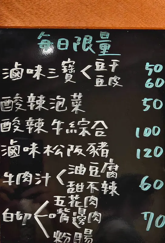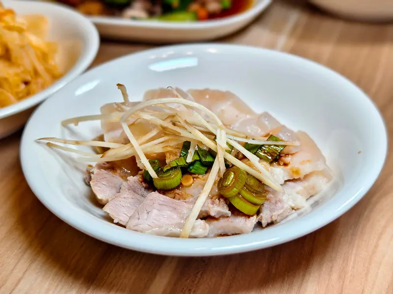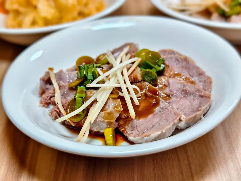 豐富的私房小菜依每日市場供給變換,價格落在 50 至 100 元間,擁有絕對獨立的品嚐時光。 70 元的白切嘴邊肉火候精準,肉質軟嫩帶有脆 Q 咬勁; 100 元的酸辣牛綜合將帶筋牛肉拌入特調酸辣醬汁,明亮酸度完美化解油脂。 70 元的白切五花肉肥瘦勻稱,搭配蒜泥醬油盡顯庶民樸實風味。最後配上 50 元爽脆的酸辣泡菜,酸辣交織的發酵氣息沒有過度負擔,在濃郁肉食與海鮮間扮演了極佳的轉換角色。