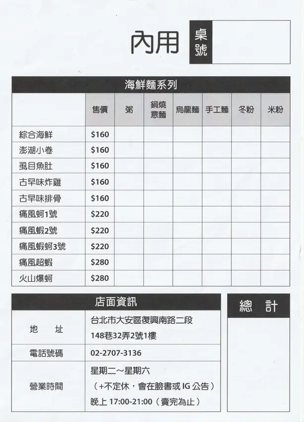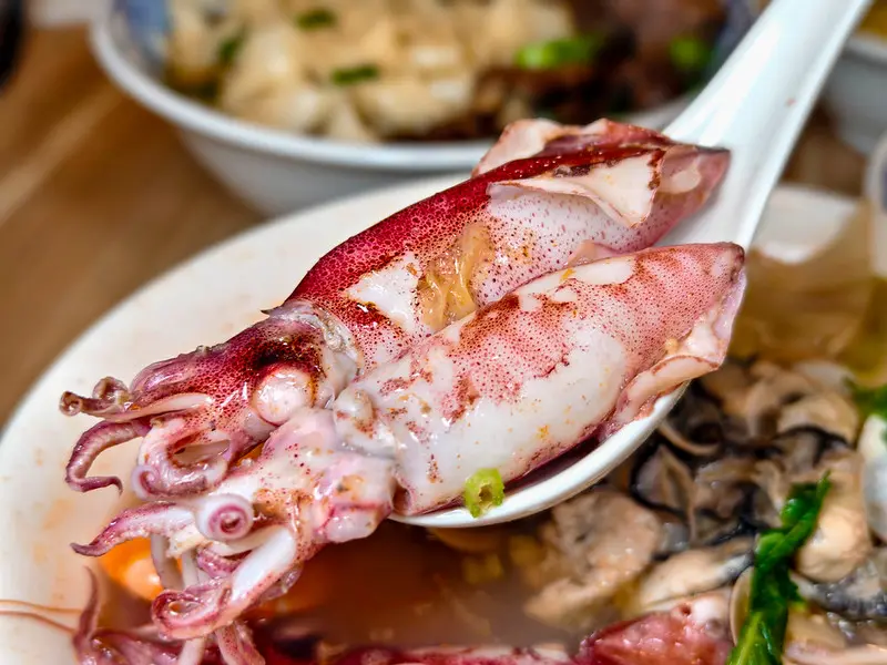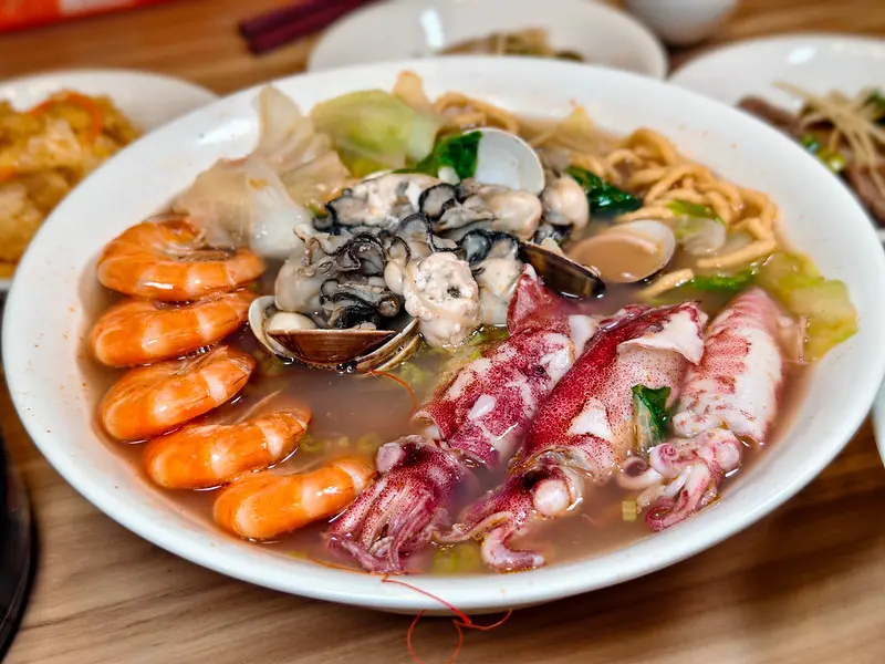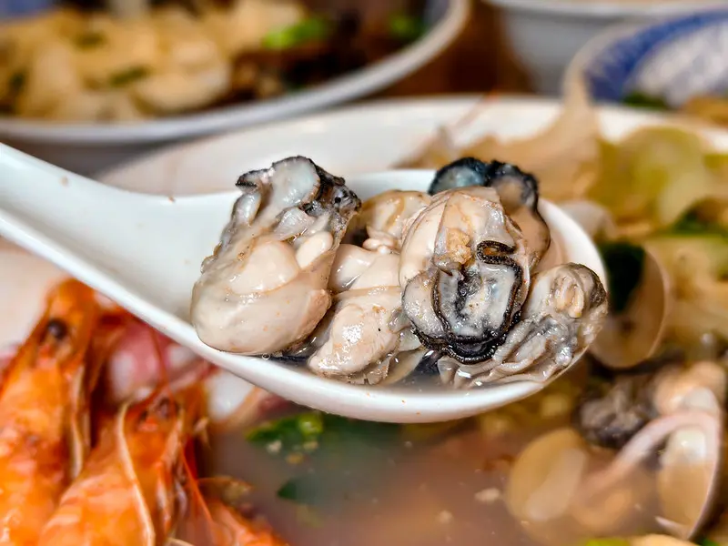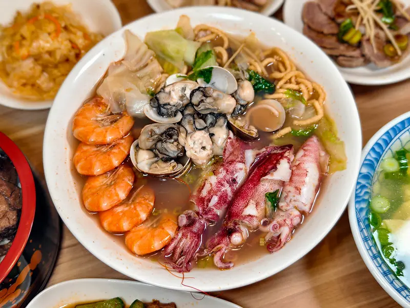 定價 280 元的痛風超蝦海鮮麵上桌時,幾乎看不見底下的意麵。白蝦、澎湖小卷、鮮蚵與蛤蠣毫不客氣地鋪滿碗面。湯頭沒有過多繁複調味,喝的是海鮮本身的清甜與自然底蘊。小卷肉厚鮮脆,白蝦剝來毫不黏殼,鮮蚵肚腹飽滿,與吸附海潮精華的鍋燒意麵一同咀嚼,展現出直白而不加掩飾的極致豐饒。