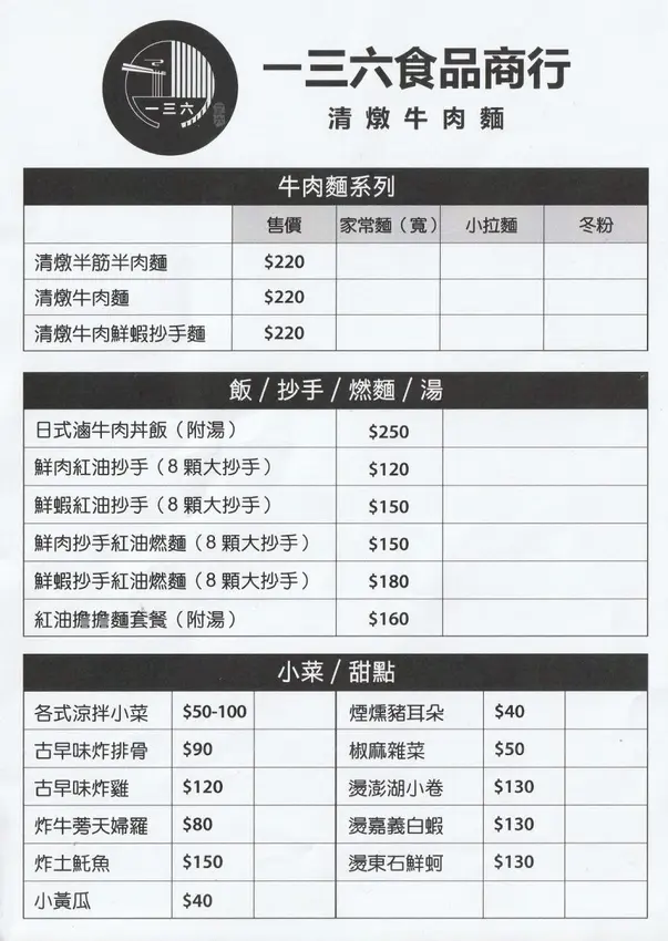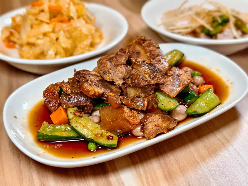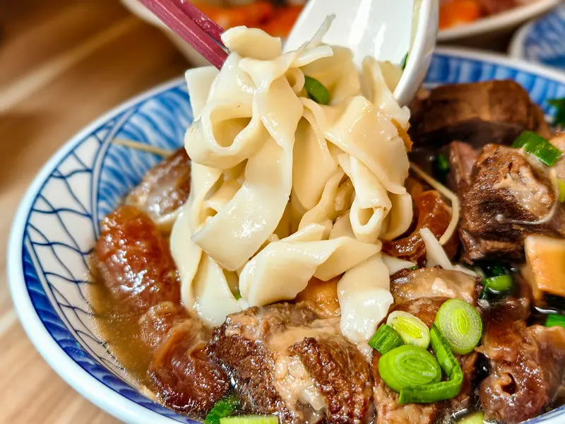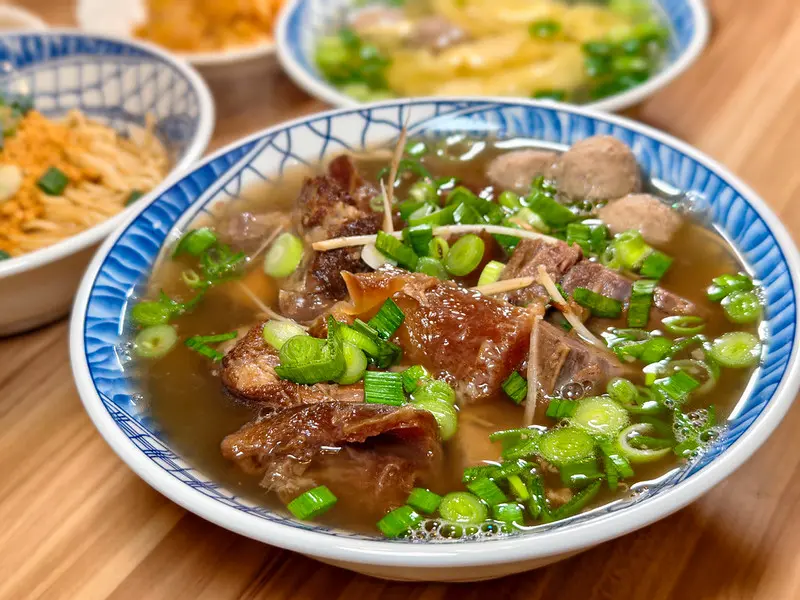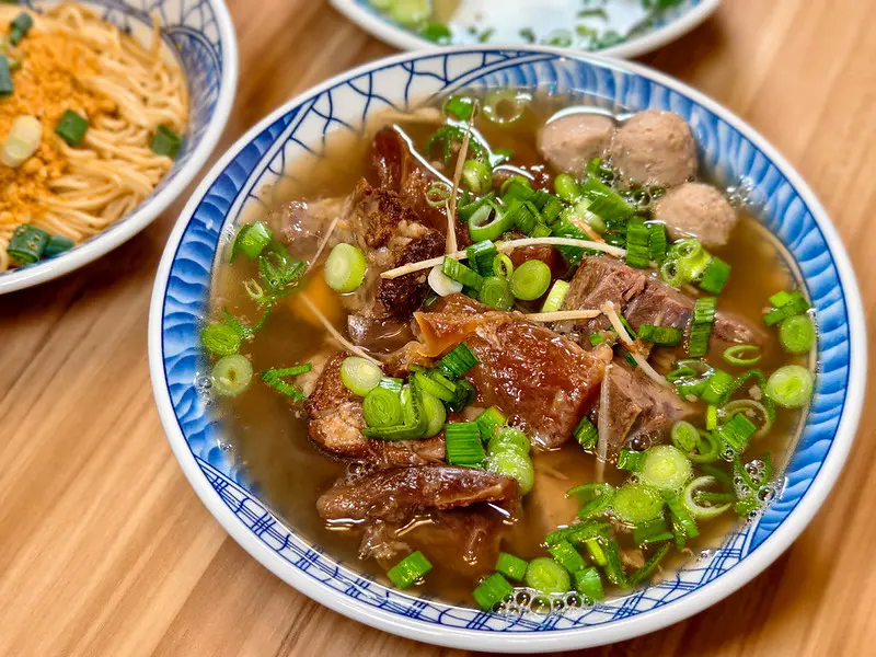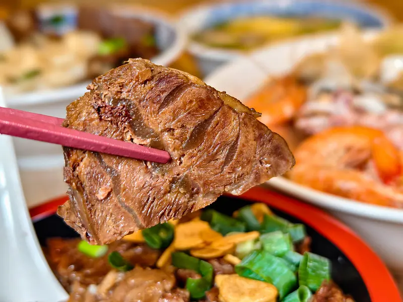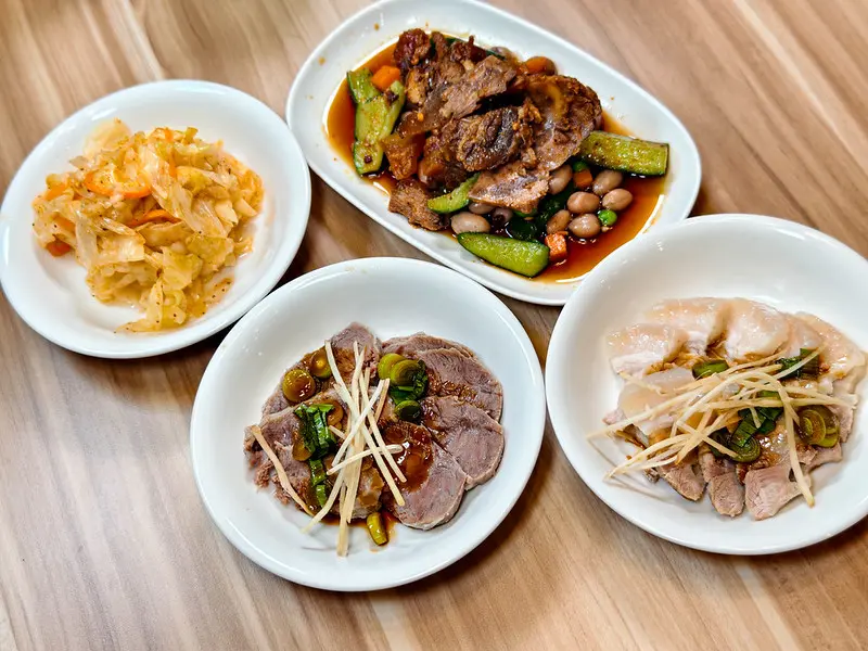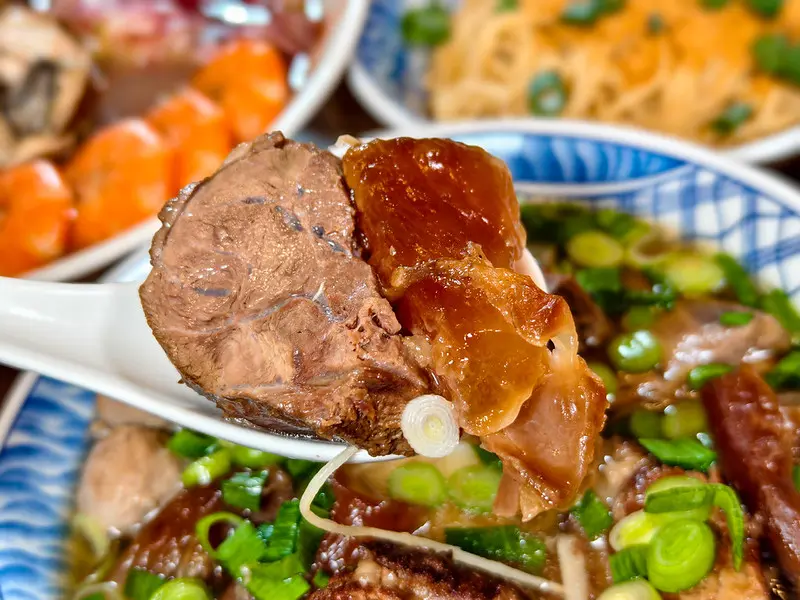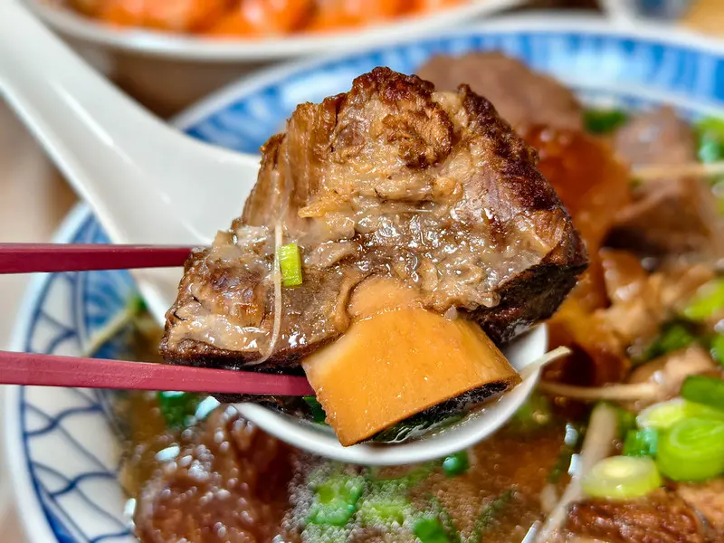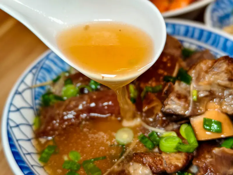 售價 220 元的清燉半筋半肉麵表現同樣亮眼。清澈如茶的湯頭,入口散發牛骨慢熬的甘醇。肉塊部分頗具巧思,不僅有軟透帶 Q 勁的牛筋與厚實牛肉塊,更特意加入帶骨的牛小排棒棒骨,帶來啃骨吮髓的食趣。寬版家常麵條煮得恰到好處,不糊不爛且完美掛住湯汁,與牛肉的豐腴相得益彰。