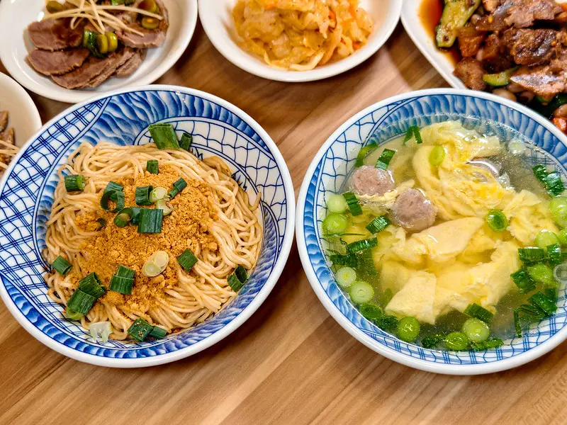 尋覓飲食的過程總是充滿驚喜。這家店藏得極深,隱身於復興南路 2 段的靜巷之中,走到巷底幾近地下停車場入口處,才能看見窗櫺間透出的溫潤燈光。有別於早年在安東市場裡的喧囂,復興店的空間顯得從容許多。木質調裝潢洗淨了傳統小吃店的油膩感,甚至僻出了一方半包廂格局。開放式廚房霧氣蒸騰,卻聞不到刺鼻油煙。調料台上備有自製辣椒醬油與辣椒醋,伴隨灶台前俐落的下麵聲,讓人心生踏實。
