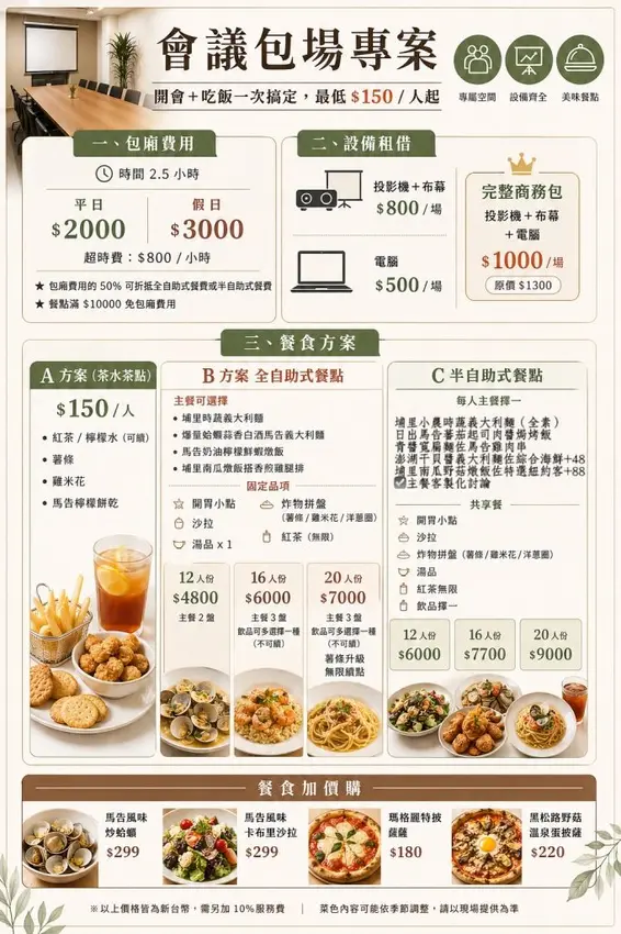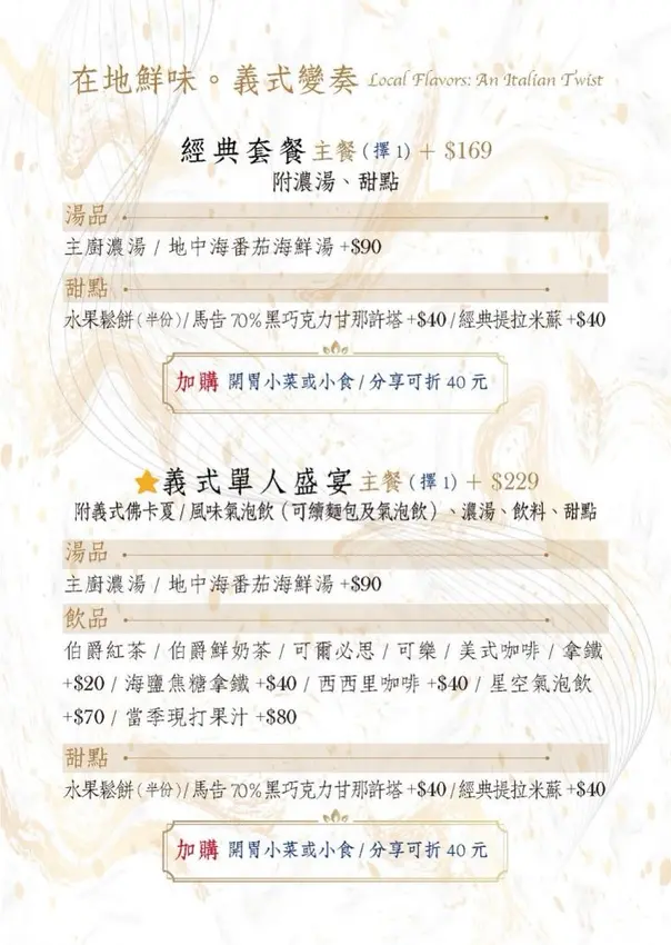 義式單人饗宴套餐-主餐價格+💰229元(前菜+佛卡夏+風味氣泡飲+湯+飲料+甜點)