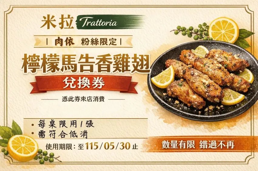 只要憑圖片即可來店消費內用即可兌換檸檬馬告香雞翅乙份。