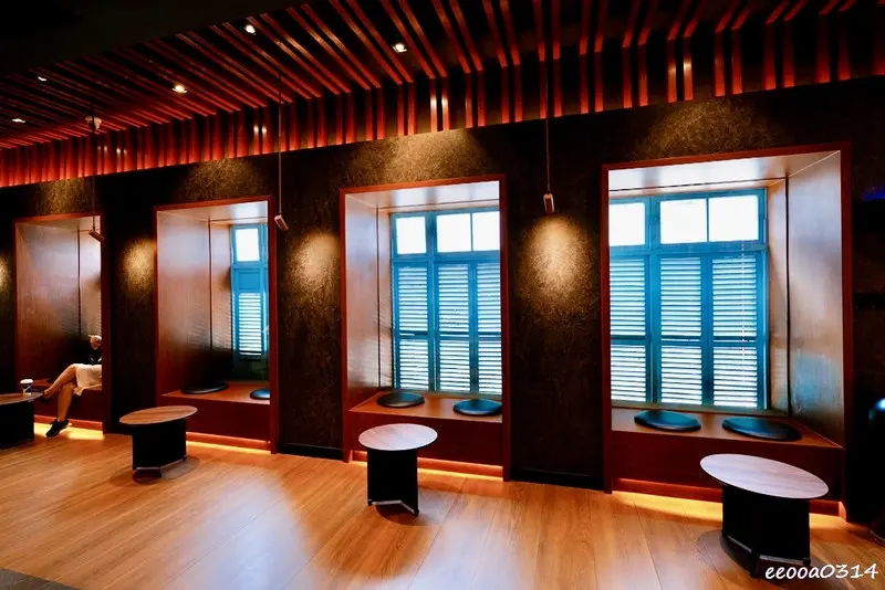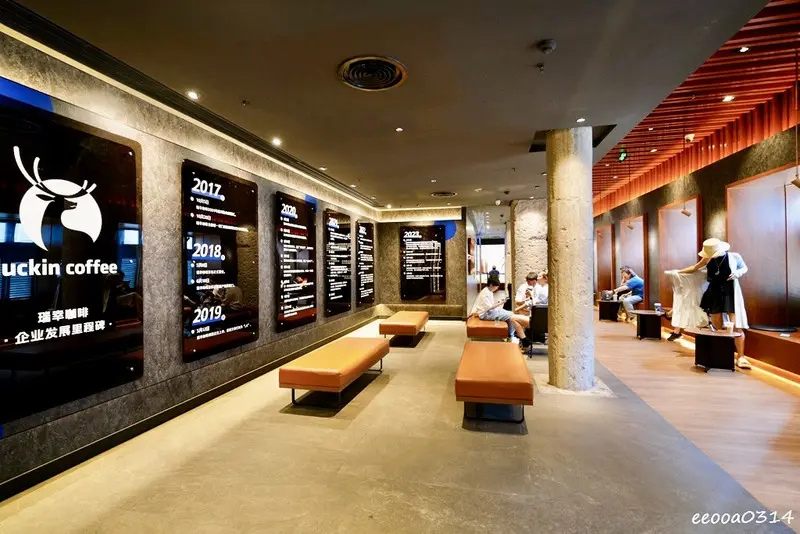 走上二樓,像是一個小型的品牌博物館,牆上展示著瑞幸的成長歷程與紀錄片,一旁還有一整排的窗邊桌位可以悠閒喝咖啡。