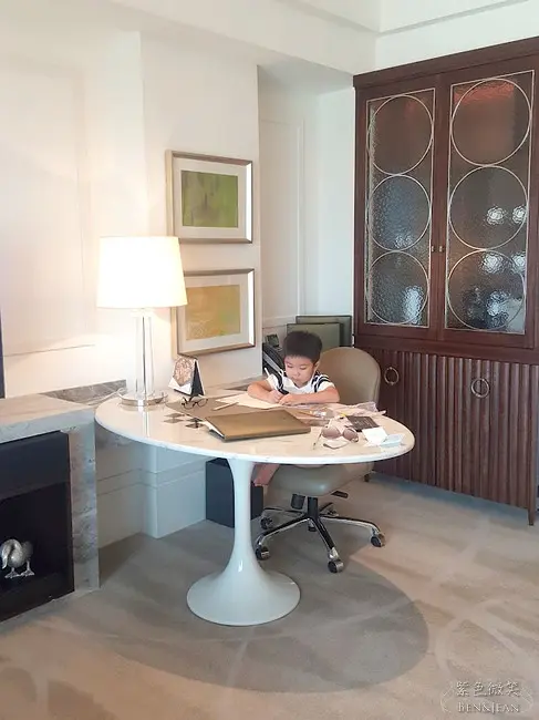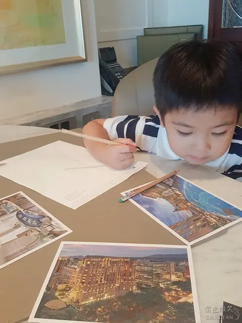 看到大型辦公桌愛畫畫的小貝果馬上開工作畫,他說要把這裡的美麗畫下來