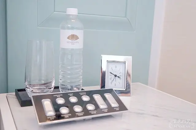 房間的床頭桌旁除了放有礦泉水,還貼心的放了水杯!