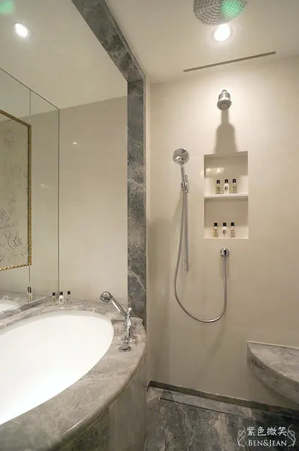 這是住宿旅客使用的大理石浴室及獨立浴缸和淋浴間,大量石材為鋪面,營造出低調奢華的極緻感受啊