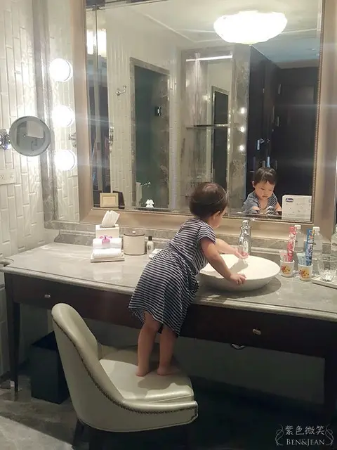 考量到小朋友一起入住,飯店貼心安排了兩間可以互相連通的房間,外面大門關上,讓我們住起來更加的舒適。我們笑稱爸媽的房間和小孩的房間,小貝果和小榛果看到自己有房間開心的跳著呢!