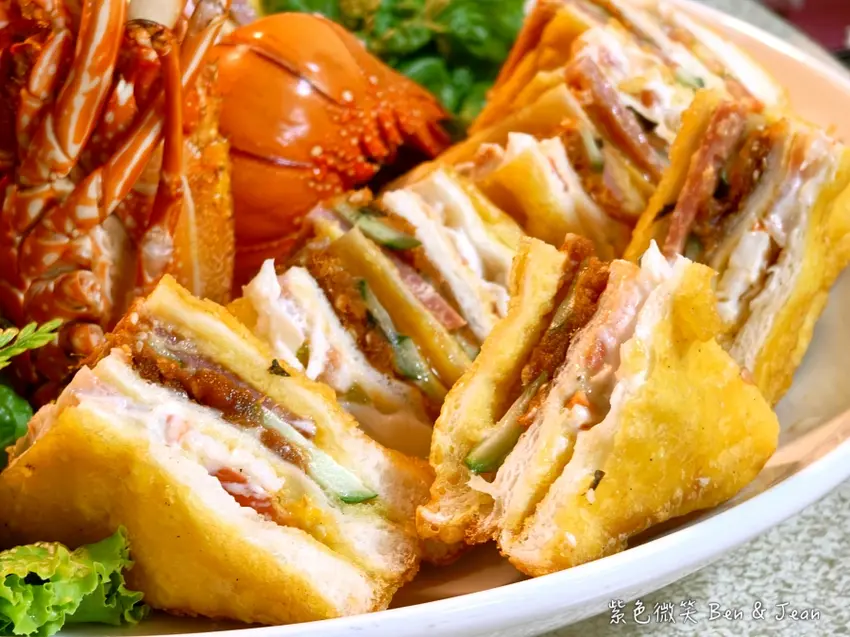 吐司的外皮炸的金黃香酥,內餡是龍蝦肉、火腿、小黃瓜跟特調美乃滋,一口咬下超級滿足
