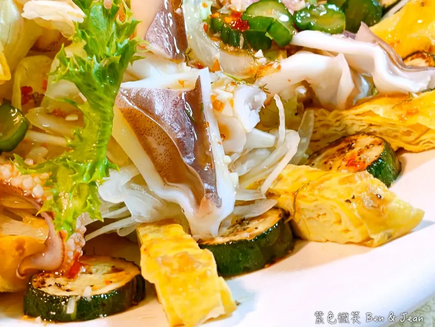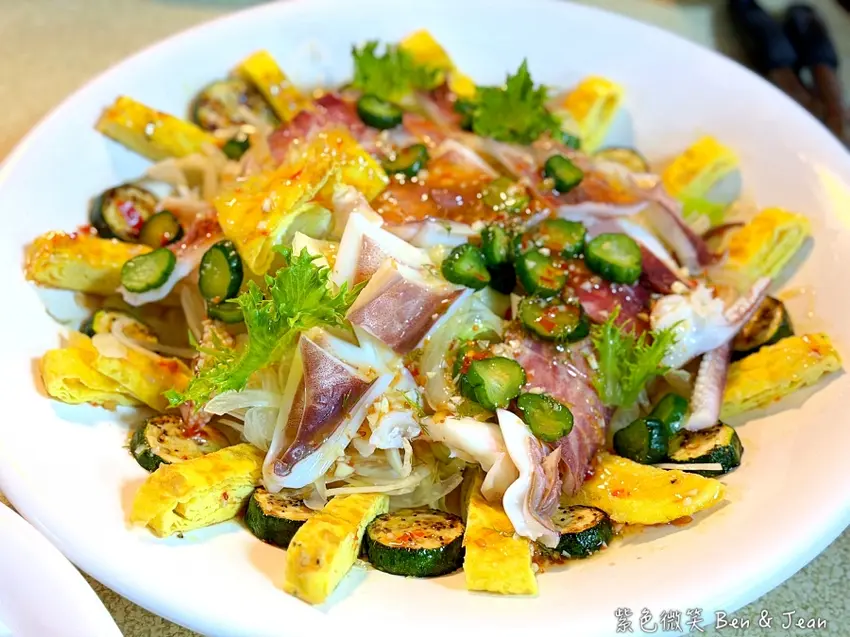 切片的大透抽搭配清爽的生菜,一旁用櫛瓜和玉子燒點綴,加上清爽的醬汁後,口感非常有層次,