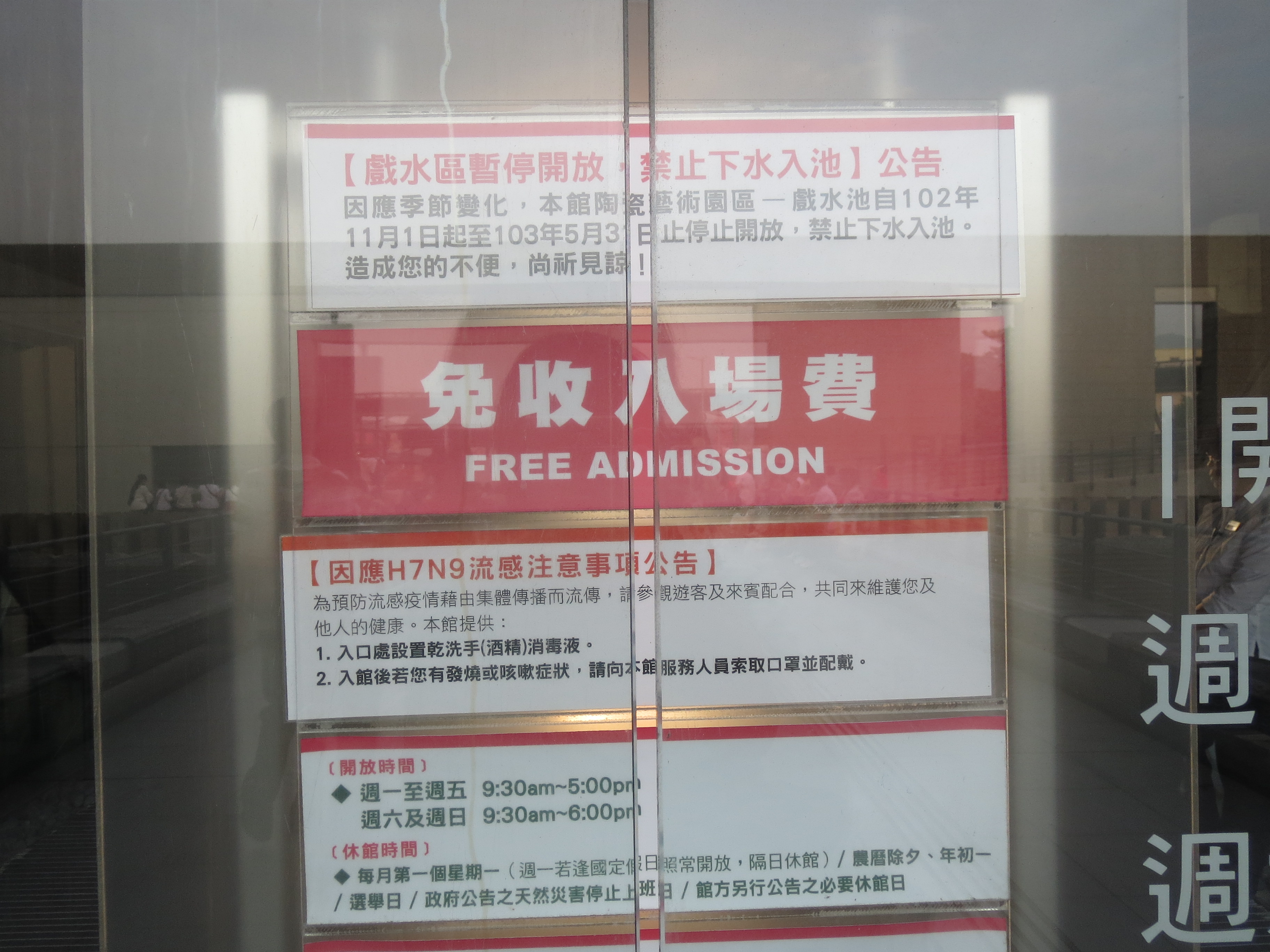 中間的建築物就是陶博館的出入口,旁邊有一些相關的公告,其中包括開放時間、休館時間和流感注意事項等等。讓我感到有點遺憾的是,戲水區在前幾天已經停止開放了。雖然我沒有想要玩水的意思,但是少了一個景點可以拍,也等於少了一個見識的機會。