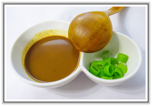 捲讓在筷子上的墨魚麵,在抽出筷子的那一剎那掉落在碗底下的醬汁,