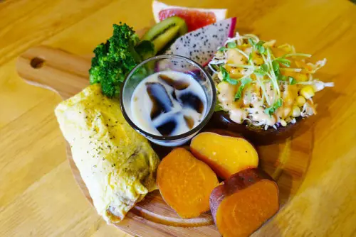 A餐:香濃玉米濃湯+生菜沙拉(千島醬、蜂蜜芥末、芒果醬)