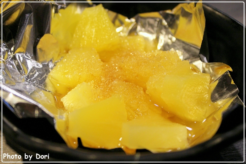 吃完燒肉,若感覺太膩也可來道烤鳳梨,鳳梨的酸甜果肉灑上砂糖,與錫箔紙一起放入烤網上,溫熱的鳳梨肉確實能有助腸胃消化,非常大推!