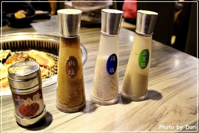 吃燒烤當然也需要佐料,四罐分別為七味粉、椒塩、海鹽、芥末鹽,個人推薦海鹽及七味粉,也算是燒烤店最常使用的。