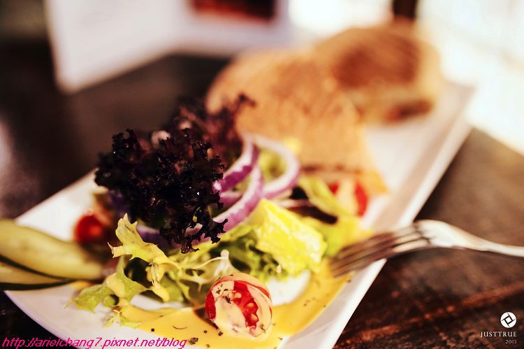 友人點的起司燻雞帕里尼,生菜沙拉酸甜甜的能開胃,而帕里尼一送上來熱熱的起司還會牽絲,麵包烤得酥脆加上雞肉調味的有汁入味,友人大推的一道!