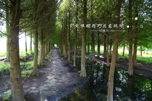 35.奧萬大的生態池,池面佈滿了綠色的浮萍,搭配池邊的楓樹與遠山藍天,令人心曠神怡。