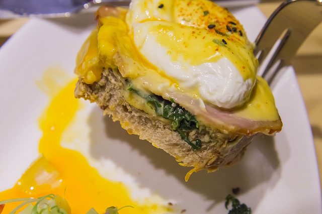 班尼克蛋:雞蛋、火腿、起士、波菜等等加在一起,劃一刀魔鬼的蛋液流出,