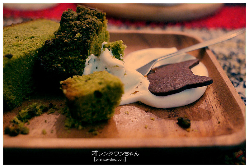 沉綠的抹茶蛋糕兩塊..佐上一抹純白綿柔鮮奶油..還有一塊小貓餅乾在奶油中若隱若現..
