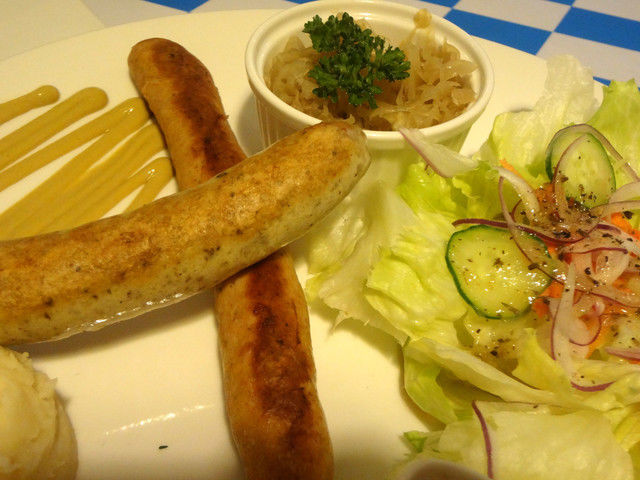 老闆娘推薦我們點的口味甜椒手工香腸、白香腸
