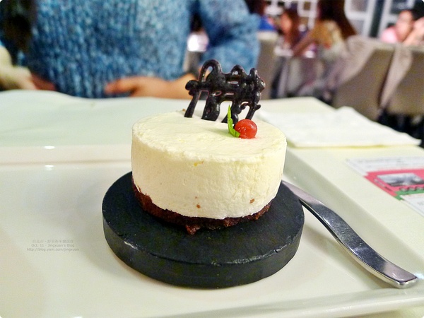 而甜點方面則是天使起司慕斯,上層為起司慕斯而下層則為巧克力蛋糕,內餡為覆盆苺,口感富層次。