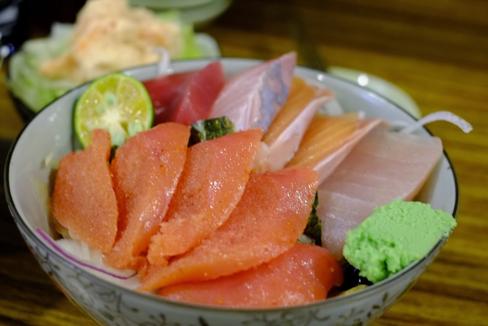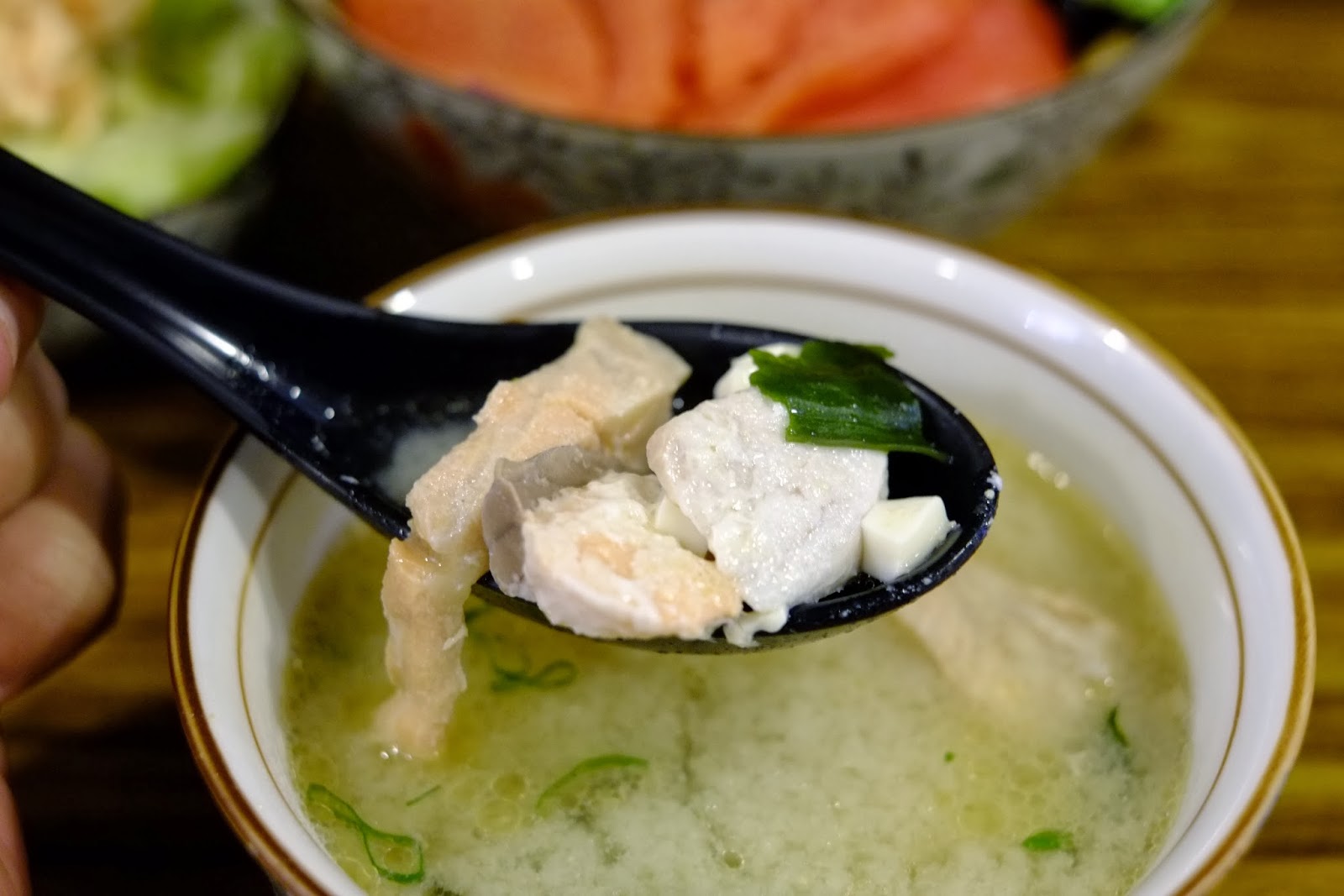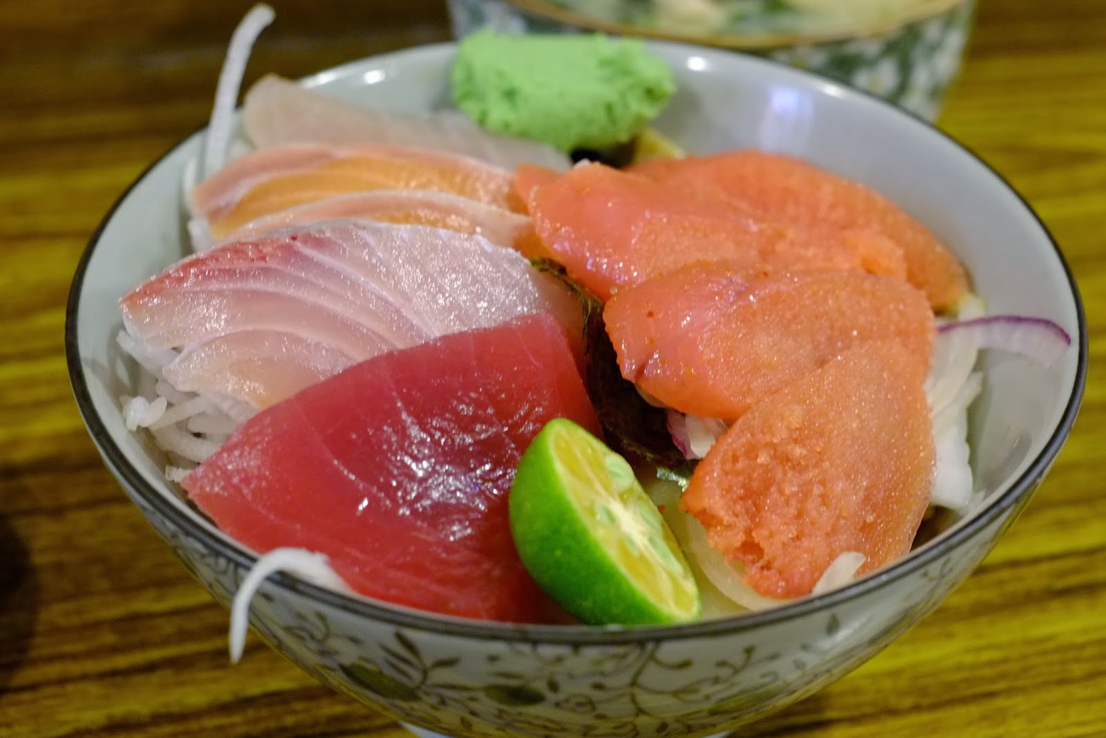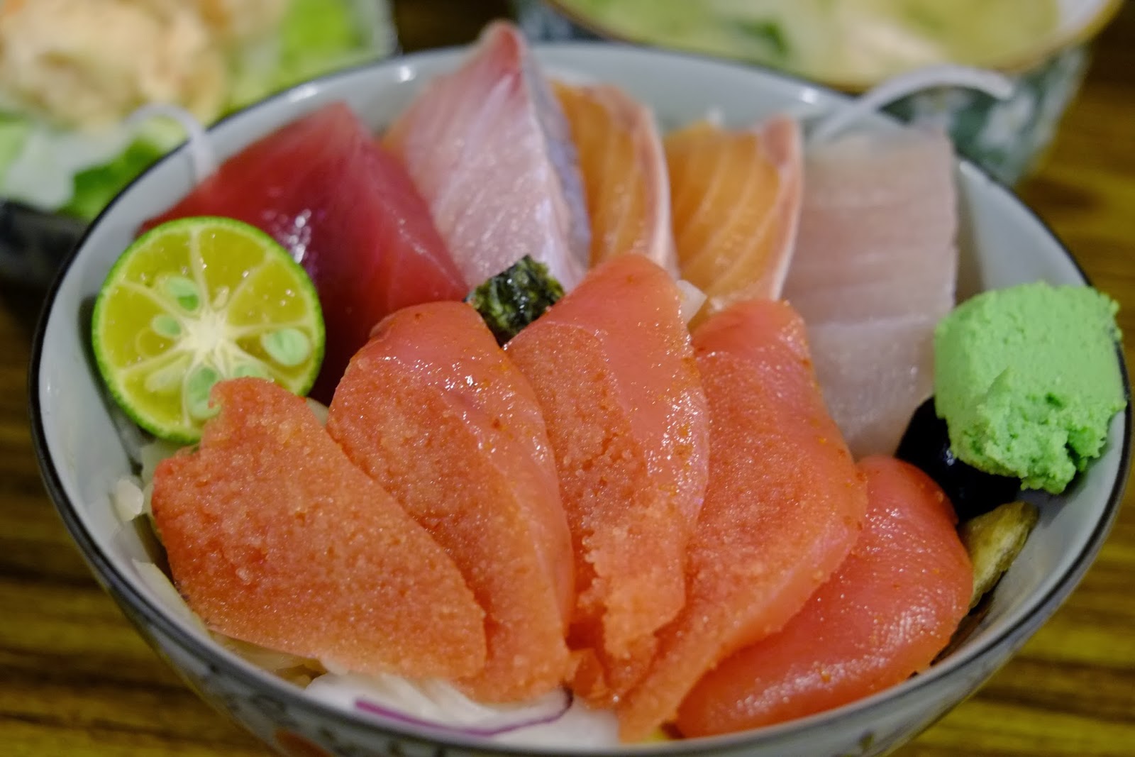 生魚片還蠻新鮮的,但我不知道是什麼魚,吃得出來部份有一兩塊魚的筋沒有處理好,有一點點難咬,但新鮮度還是有的,明太子有點鹹鹹辣辣,配上白飯與洋蔥,一直在嘴口滾動好下飯阿,至於白飯有點微溫,不是熱,也不是冷的醋飯。