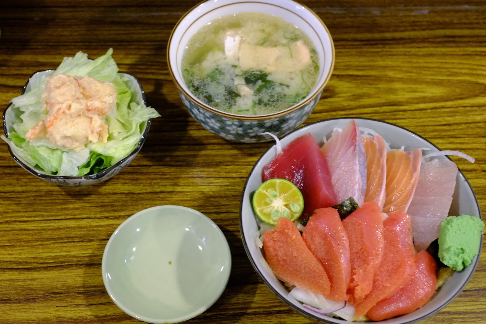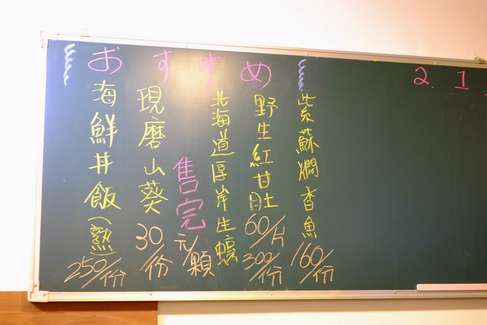 菜單一覽,價位約200~320左右,黑板還有本日精選食材(?),點了明太子什錦丼、花枝干貝丼、鮮魚味噌湯和龍蝦沙拉,生蠔當日去已經售完,也沒有賣其他熟食料理。