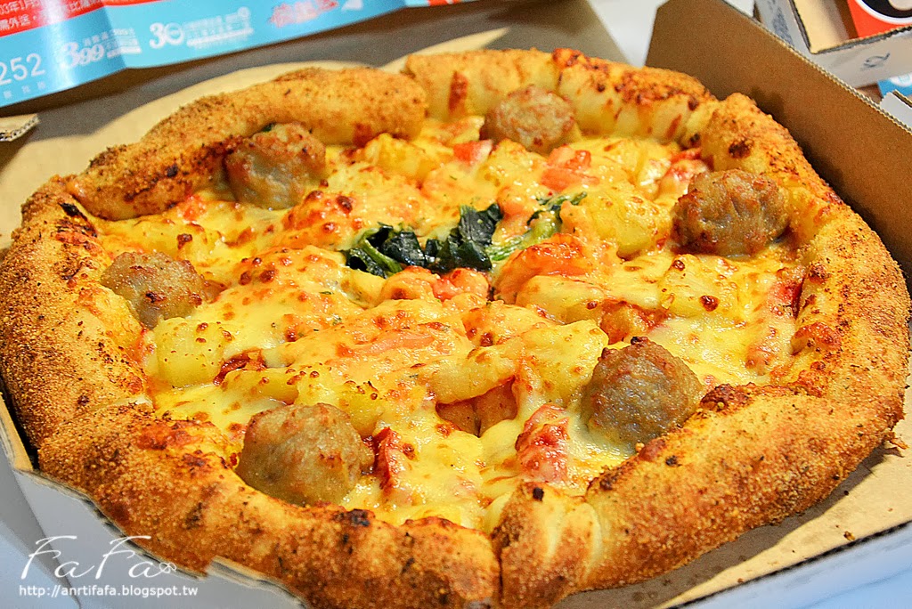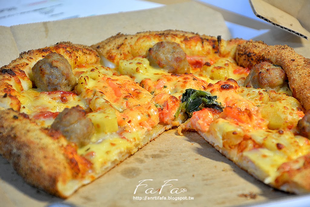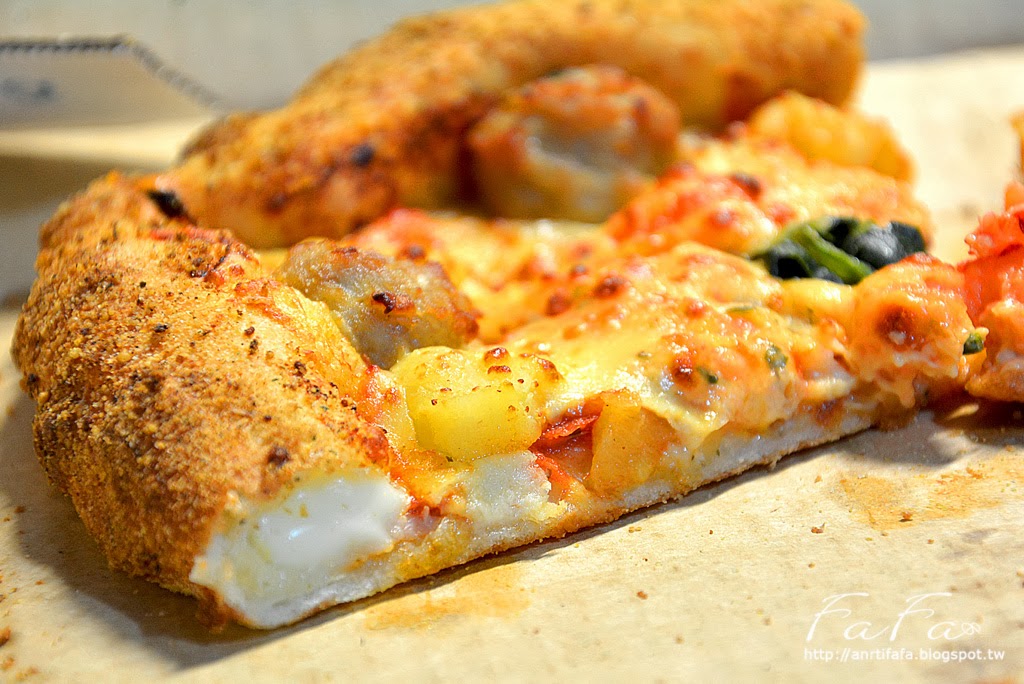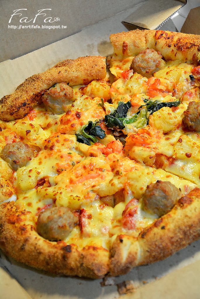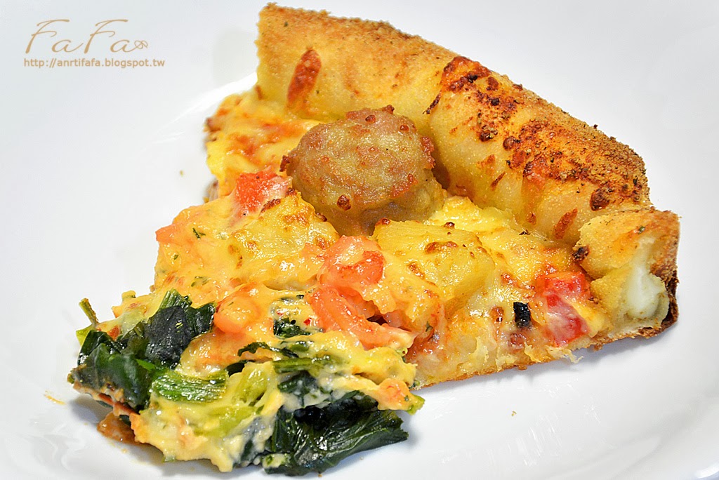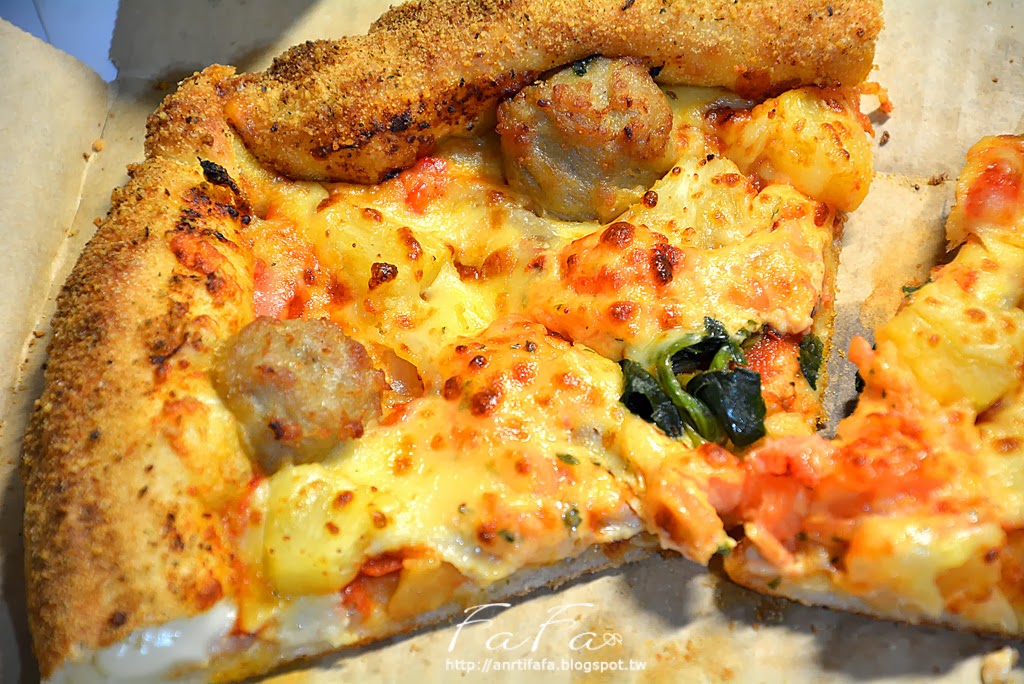 | 看著金黃色澤上隆起的起司型態,可以感覺到它的份量很彭湃, 尤其那微微焦黃的點點更增添了它的美味視覺效果;上面還分佈著義式風味香腸丁、紅椒、洋蔥, 以及中心一點綠的健康菠菜,還有爽口多汁甜味鳳梨塊,讓整體吃起來清爽不油膩。 滿滿豐富配料,想要找划算又好吃的口味,真的非他莫屬了!! |
