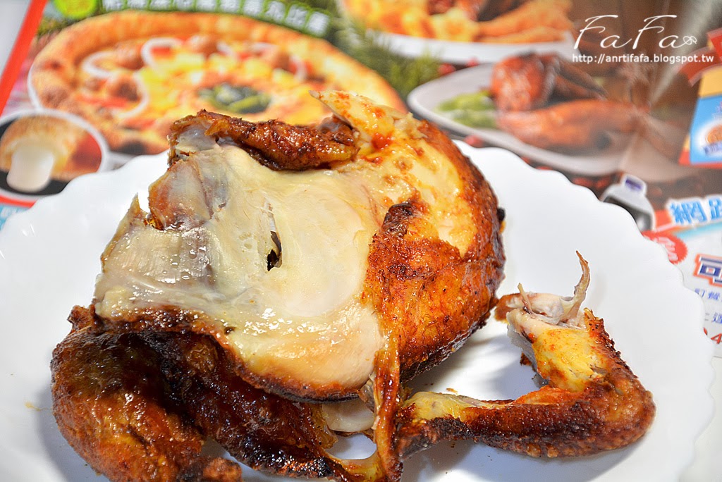 | 鴻運香汁雞嘗鮮價NT$199(原價NT$219)取的名字還真好,很露骨的把優點直接跟你說它香噴噴又多汁, 先以翻滾拍打增加肉質彈性,就像我們要按摩自己的腿一樣, 接著將雞隻以匈牙利紅椒粉、蒜粉、黑胡椒、義式香料還有一項很重要,叫做獨門秘方... 經過烘烤後再以高溫油炸,經過了轟轟烈烈的過程變成了現在的鴻運香汁雞。 |
