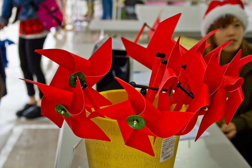 園區人員利用2萬支紅、白色的風車,組成耶誕帽