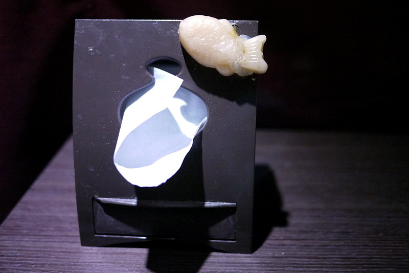 經過單剪重力擠壓內餡、得以讓餡料平均分佈整尾魚身。