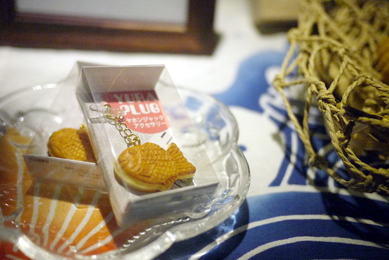 櫃檯上擺著許多鯛魚燒與丸子造型的小物,