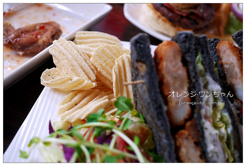 黑色的吐司夾著海鮮炸物..旁邊附上生菜跟薯片..三明治的份量也不算少..