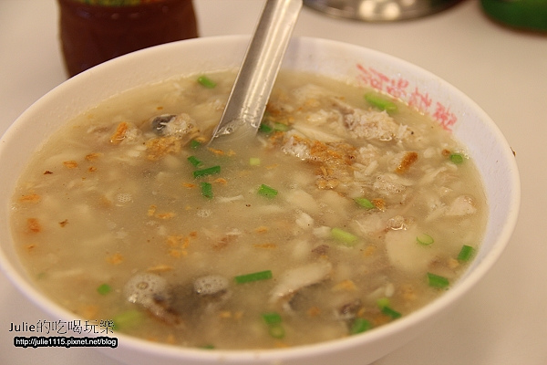 湯頭因為有魚肉跟蚵仔一起煮,所以很鮮甜~是讓人一口接著一口,不知不覺就會吃完一碗的鹹粥!