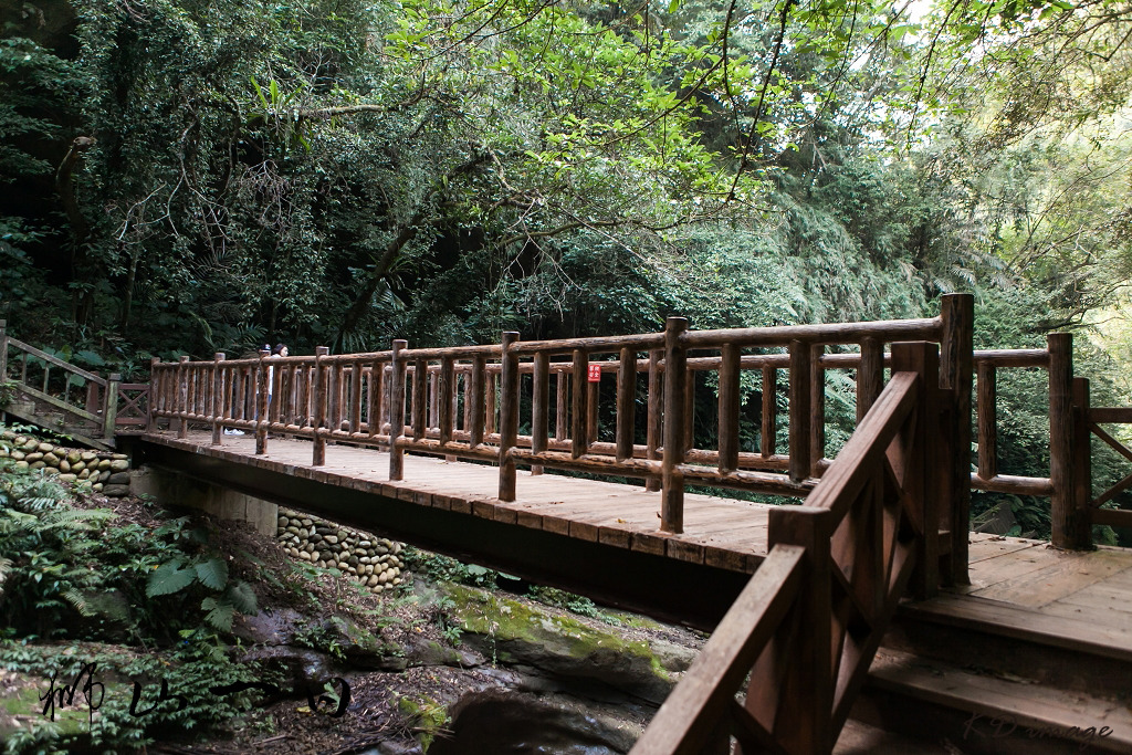 回到登山口後再轉往另一條路線走去,水濂橋步道與水濂洞部道相連,而水濂橋步道便是在往遊客中心路邊一處木梯轉往山谷下的步道,大概的地形便是往下直探溪谷再順勢上到大馬路上,全長約莫600公尺,是相對簡單好走的一條步道,延路可見三個景點:糯米橋、水濂橋、一線天,但建議不要太晚,因為地勢偏低、樹木遮天,光線上是偏暗的,若時間足夠應先走此條再選擇往山上的步道。