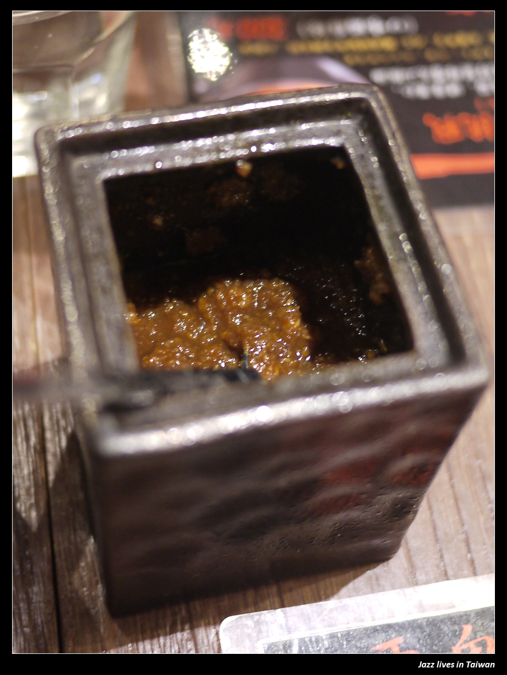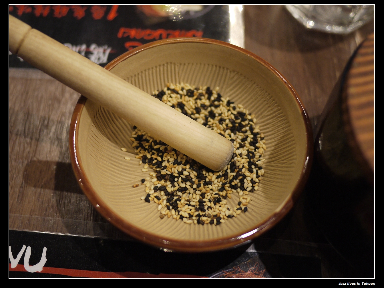 桌上的碗是拿來磨芝麻的, 中間的則是蘋果醋, 裡頭真的有蘋果切片唷!