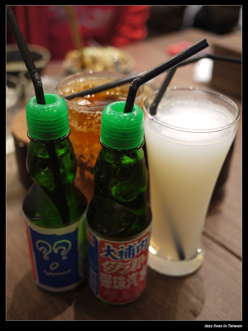 店家的飲料有彈珠汽水可以選擇唷! 來自時光隧到童年的回憶, 另外兩杯則是可爾必思與蘋果西打,
