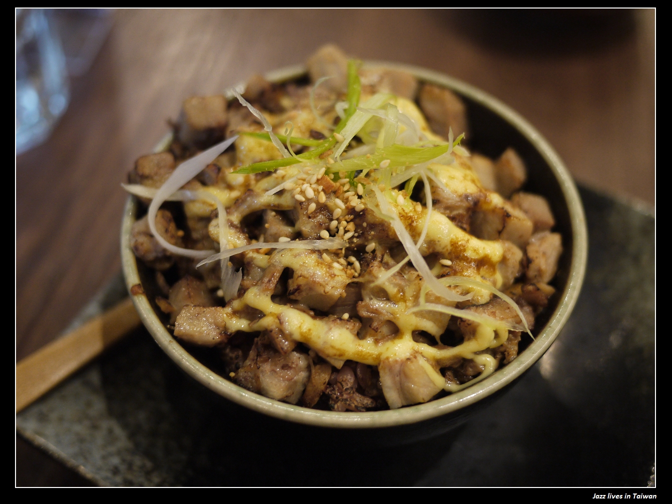 一塊一塊的叉燒淋上日式美乃滋在微微炙燒, 灑上芝麻與蔥花, 還味品嚐就繽紛的香味與視覺饗宴啊!