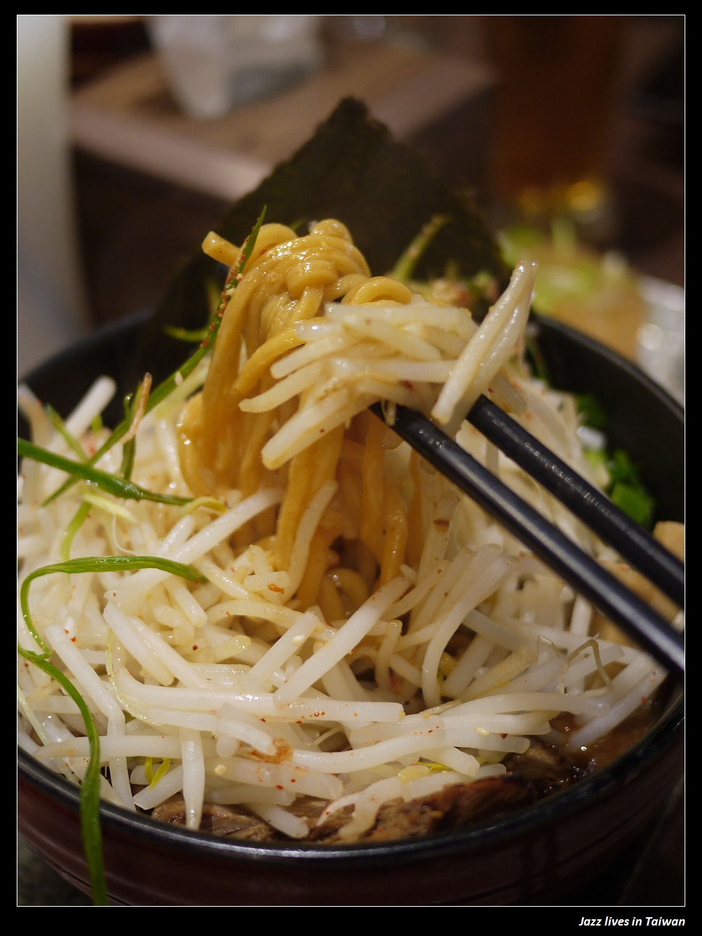惡鬼的招牌就是每一碗拉麵都提供滿滿的銀芽, 要撥開銀芽才能把底下的拉麵拖出來,