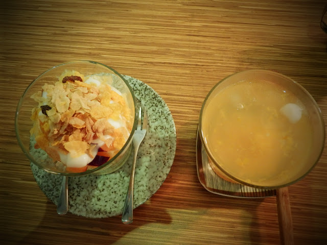 吃的有當日甜點、優格水果盅 各100元、三明治忘了多少,