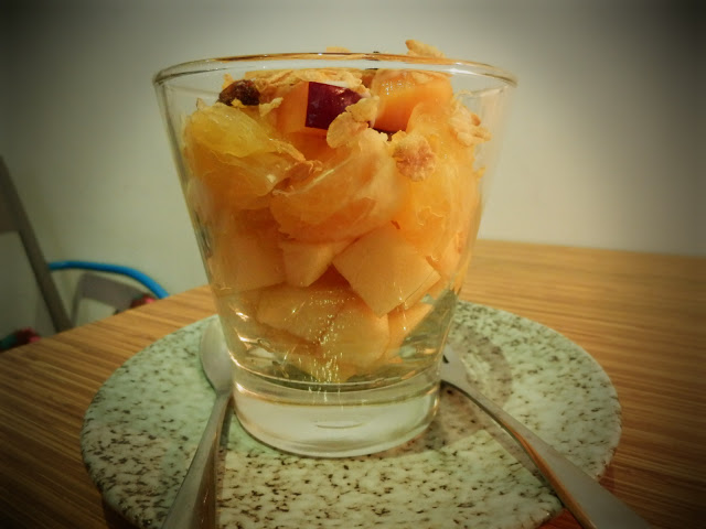 切塊的柳丁、大量蘋果丁、桃子片,加上玉米片葡萄乾,淋上優格醬。