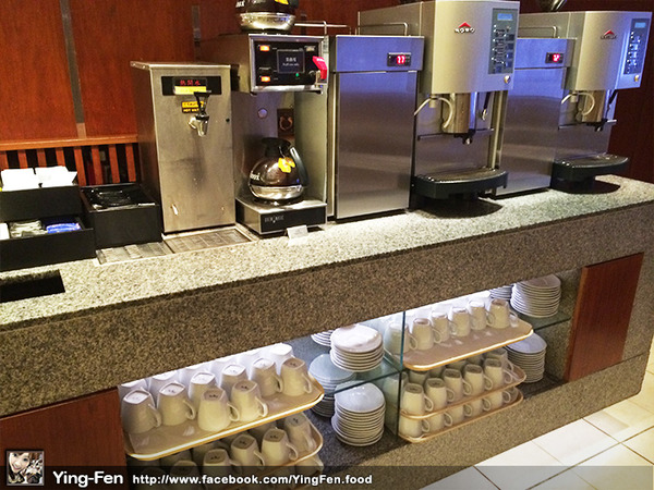 熱飲區,有熱咖啡、紅茶和熱的開水,底下有杯子自取。