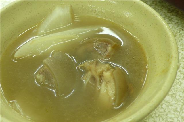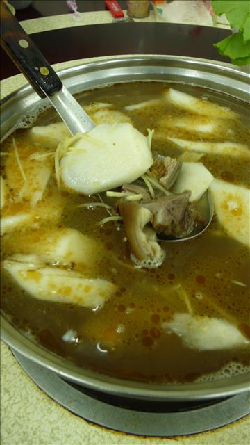 鍋底有薑絲帶皮羊五花肉塊、白蘿蔔以及羊高湯。口味清清淡淡的,完全